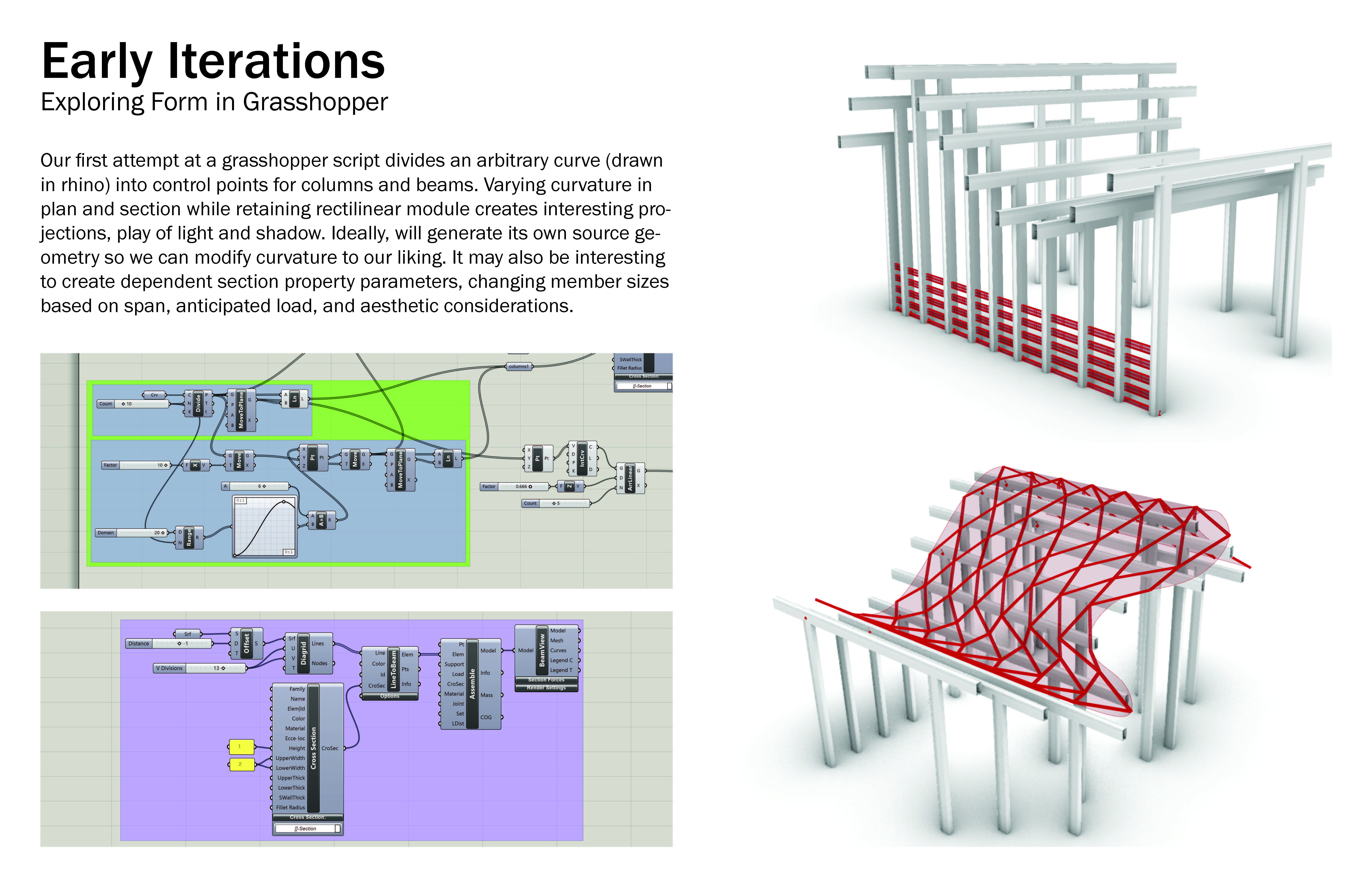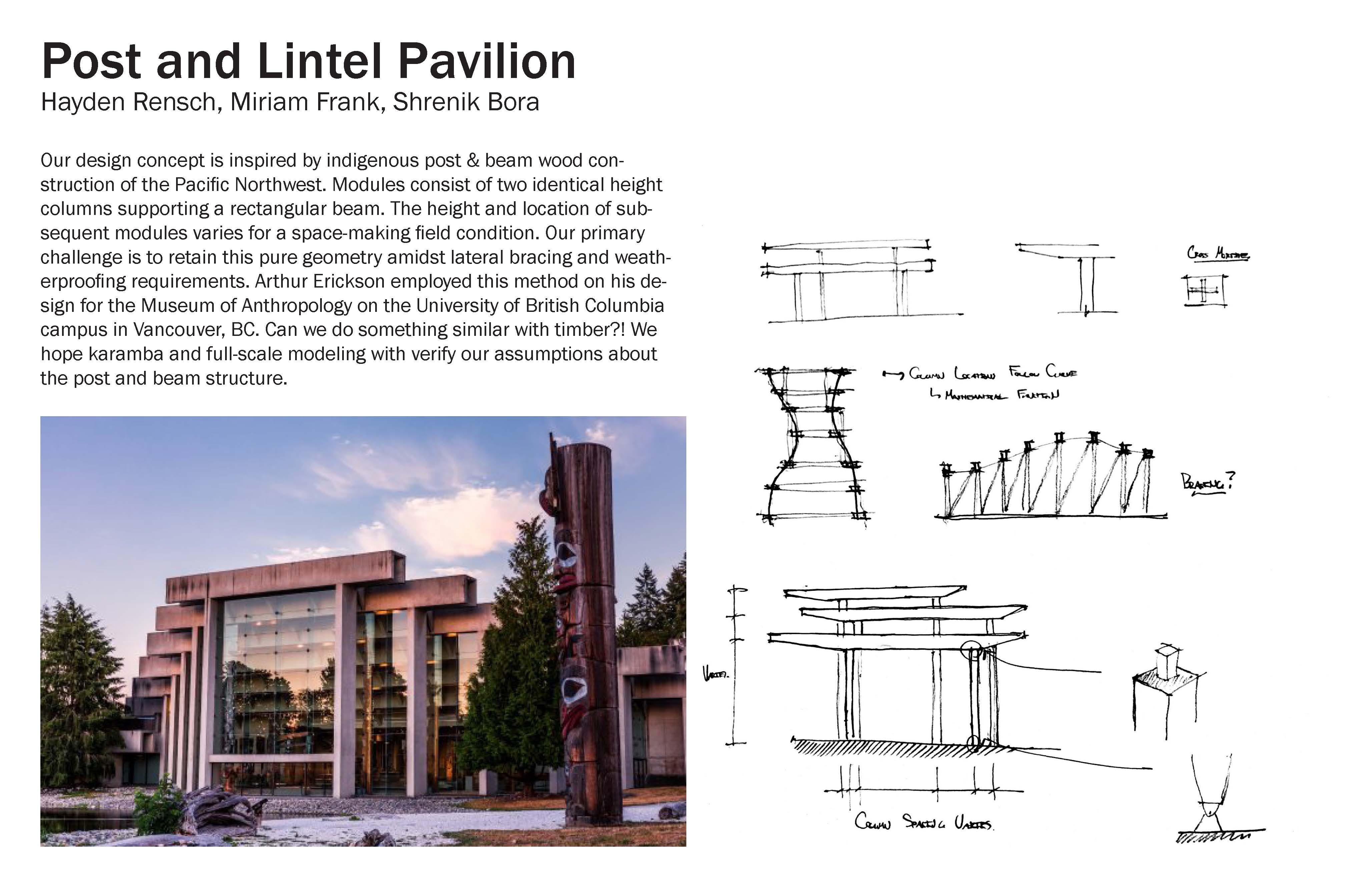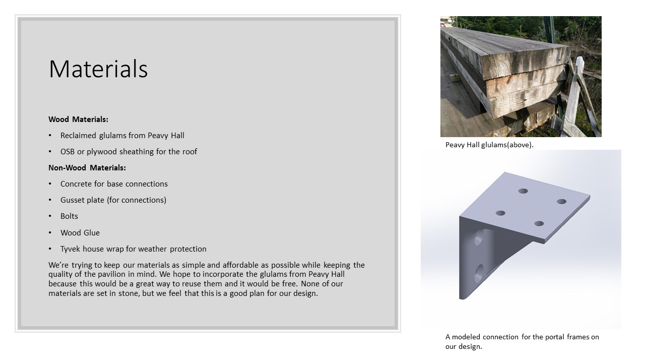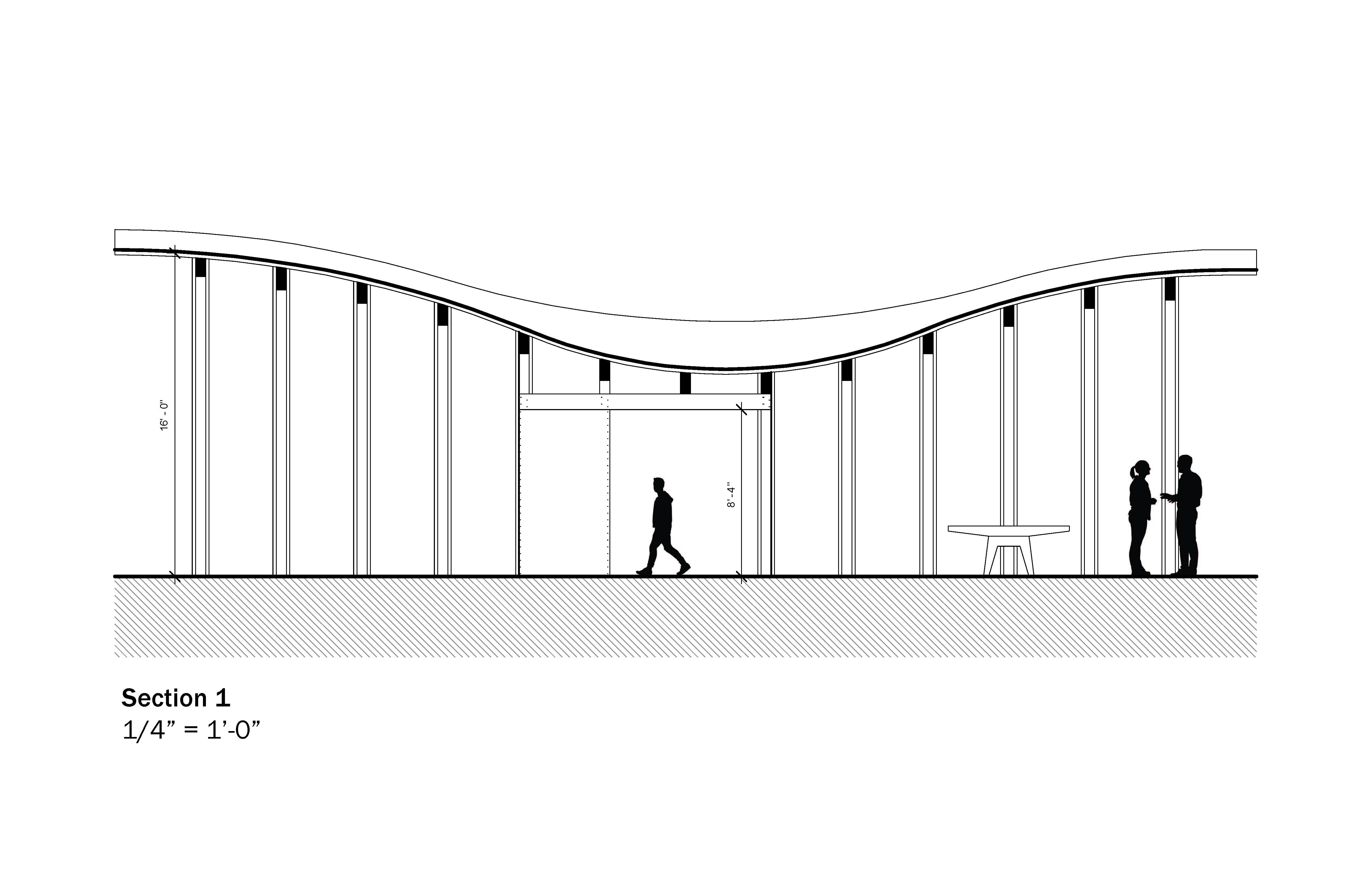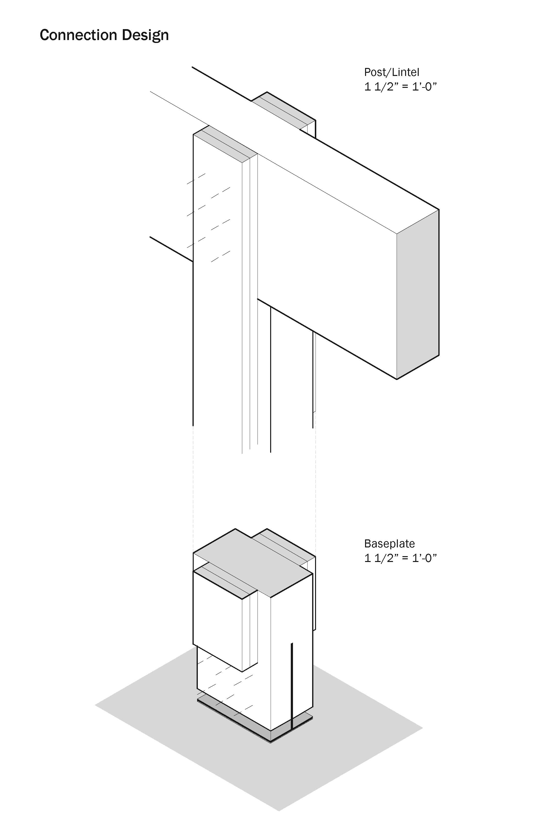 RESPONSE: Most of the comments during our review related to the size and weatherproofing strategies for our pavilion. We currently fill the site with roughly a 24′ bent stretching into a 38′ bent East to West. Reviewers and students admired the elegance and subtlety, but urged us to downsize for manageable spans and assembly. We plan to determine the maximum span of the reclaimed glulams and use this dimension to inform our plan organization. As for weatherproofing, comments fixated on exposed connections. Adding a metal cap would protect the end grain and accent the expression, similar to the point of Japanese gabled roof. We are seeking more feedback on the overall weatherproofing strategy. Incorporating a curved form (as shown in the section) may prove difficult to assemble.