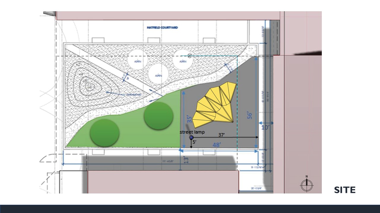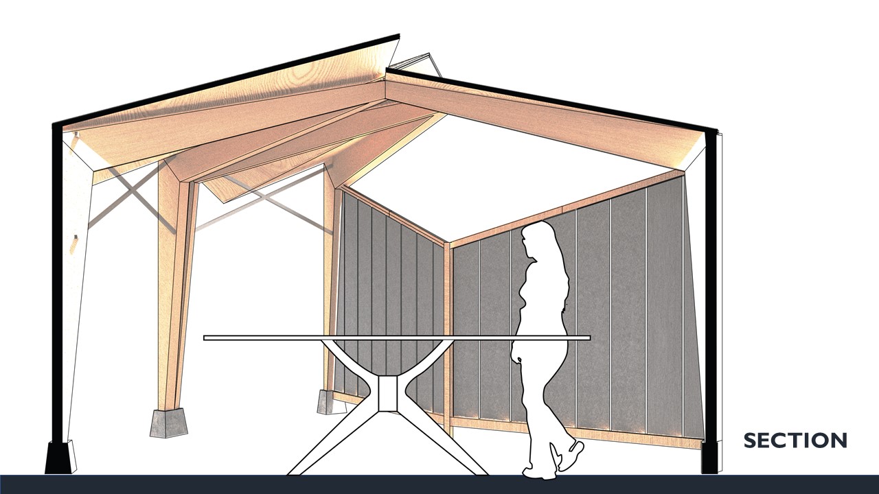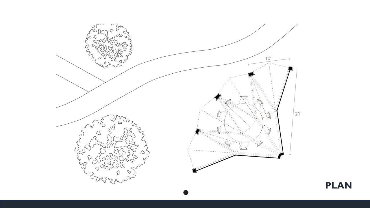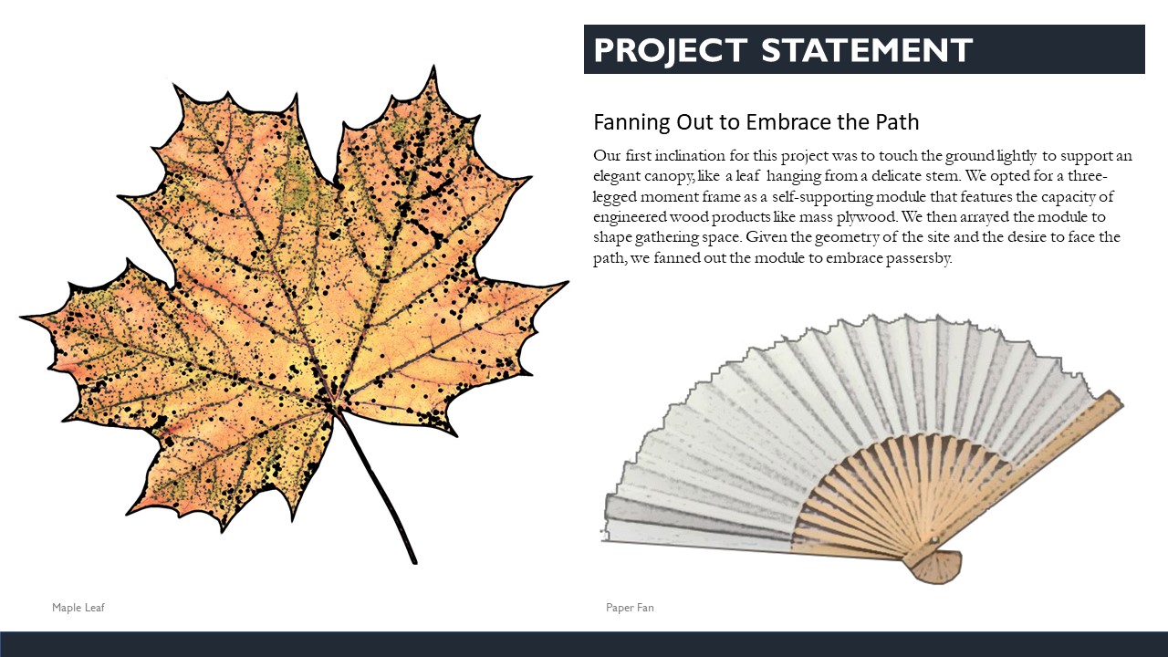 Although our form gravitated toward radial geometry reminiscent of a maple leaf or a fan, it is not optimized and is too heavy to capture the lightness of these precedents. Our reviewers suggested reducing the weight of everything as much as possible to make the design more economical and lightweight. To do so, we will need to investigate how best to modify the geometry to stiffen the frame. This includes consolidating our vertical supports, introducing a second scale of ribs to support the roof plates, and beefing up the edges of the plywood. Small changes would allow us to use far less wood grain and steel to make our pavilion stand up.