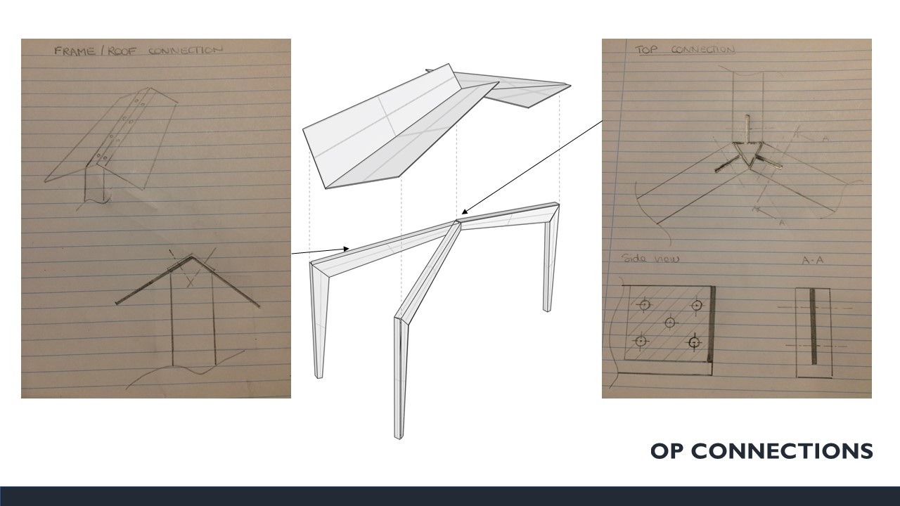 Our plan is to decide which of these new elements to include in the Karamba analysis and then to determine how much we can reduce the weight of our materials. And with fewer vertical supports, we will need to reinvent the connection at the “elbow” of our supports as inexpensively and elegantly as possible. This will be the most pressing connection to explore in-detail for our next review. Then, it is just a matter of optimizing the form using our Grasshopper script and telling a compelling story about the assembly of our pavilion.
