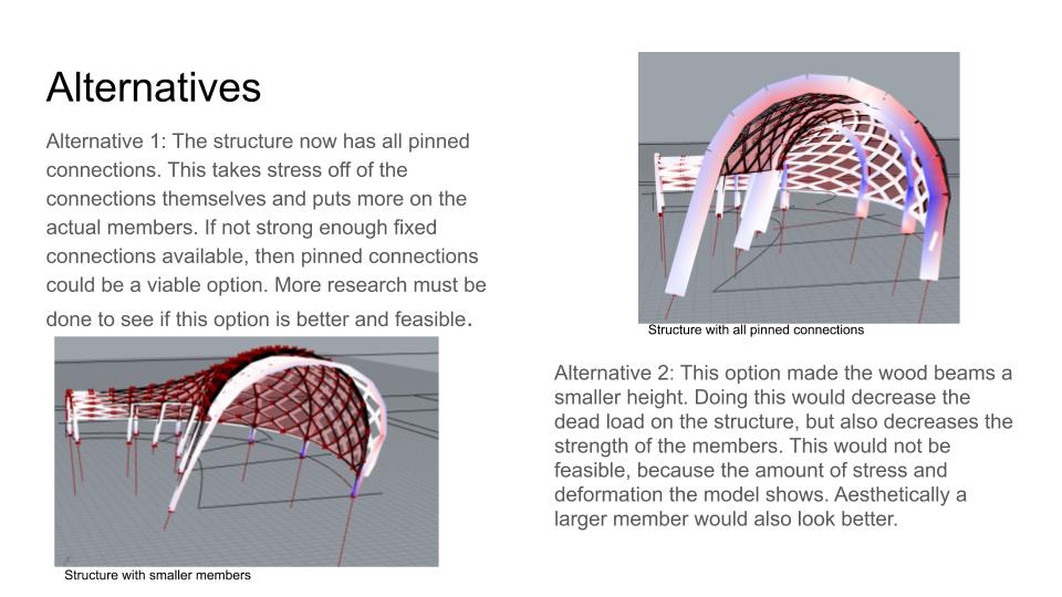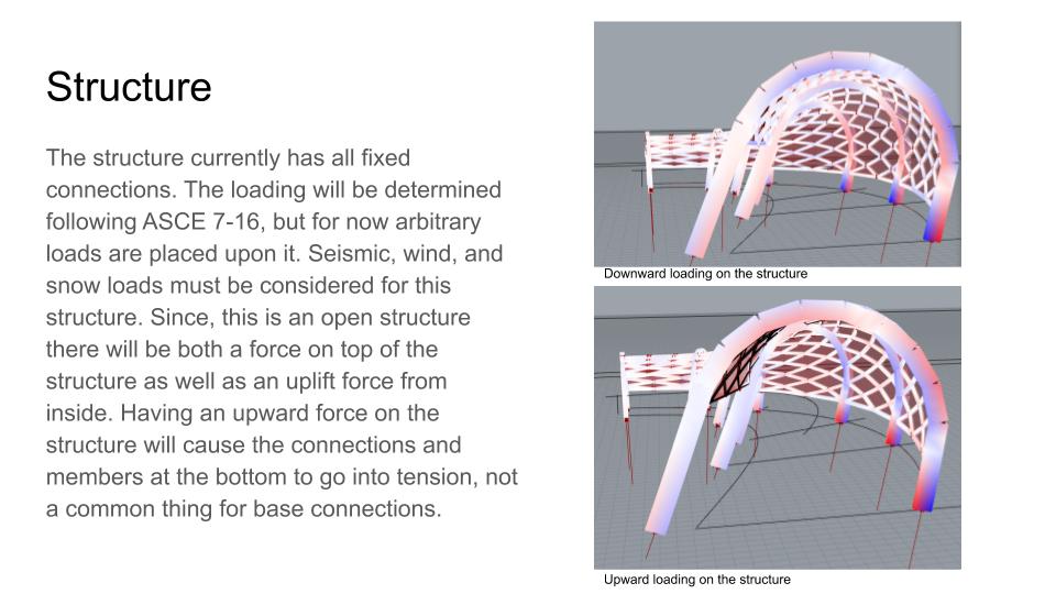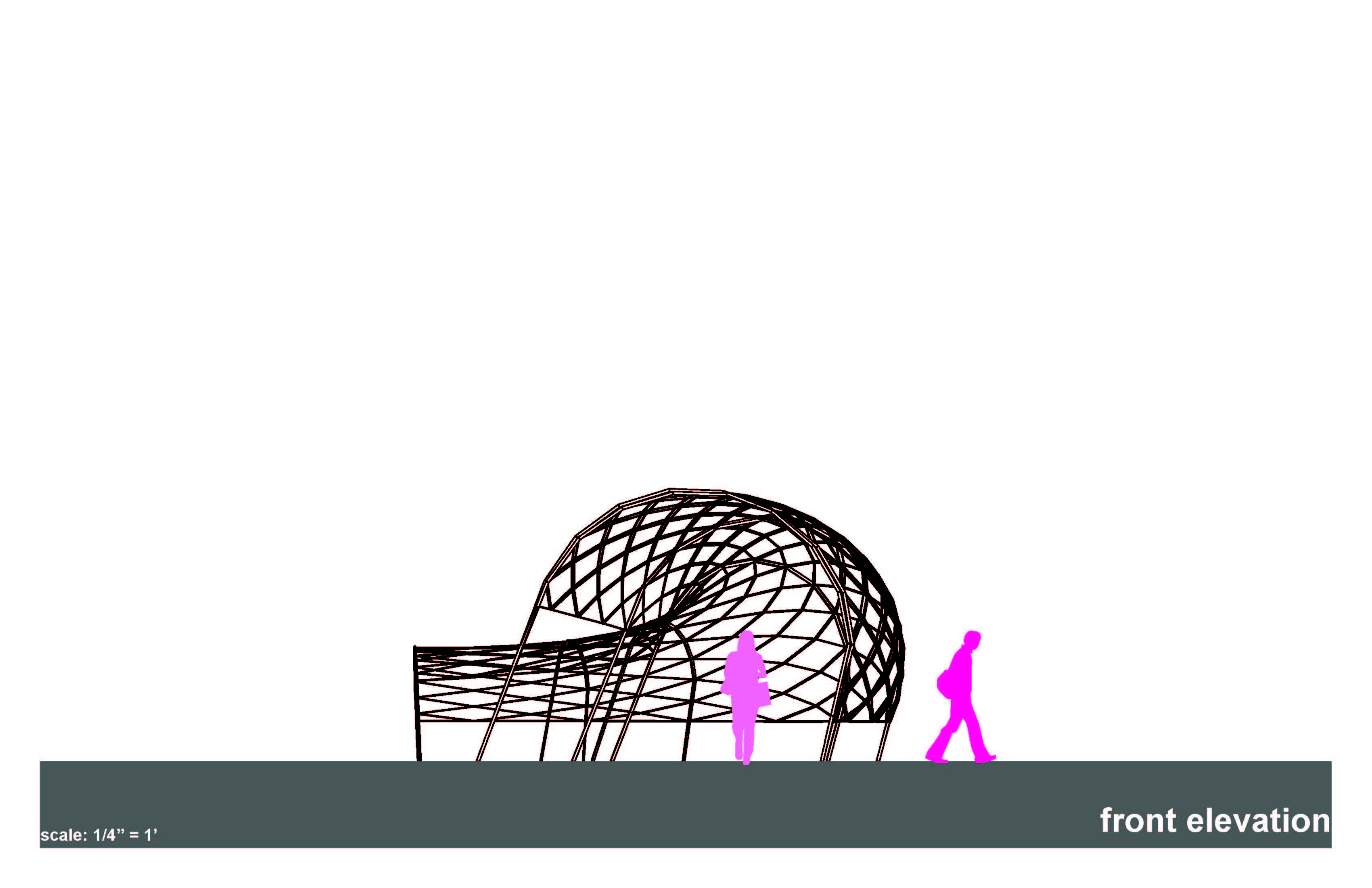 We found the structure to have some redundancies in its form; “lose the tail” according to a reviewer. The tail of the structure does seem to interfere with the user experience. With that, the orientation of the structure could be adjusted; the structure’s arches are inviting but the open side distracts the arches as the primary entrance. Suggestions leaned towards creating a greater curve in plan to allow more dynamic path of travel, (entrance to exit from either end).