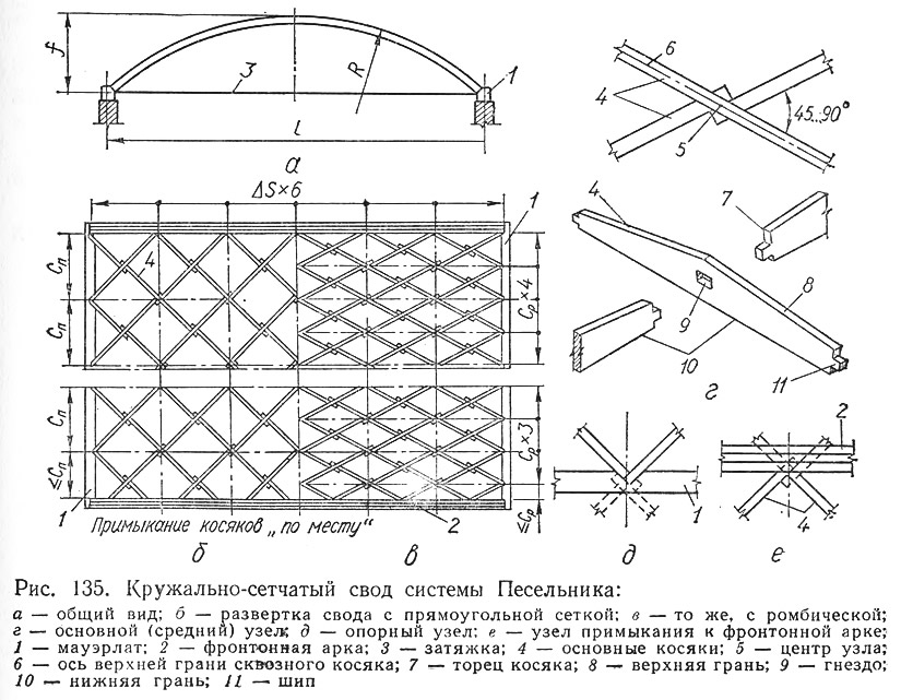 where the roof is constructed in an arched network consisting of a single lamellae arranged in rhombic form. The vault system comprises short structural members interwoven across a curved surface in a diamond pattern.