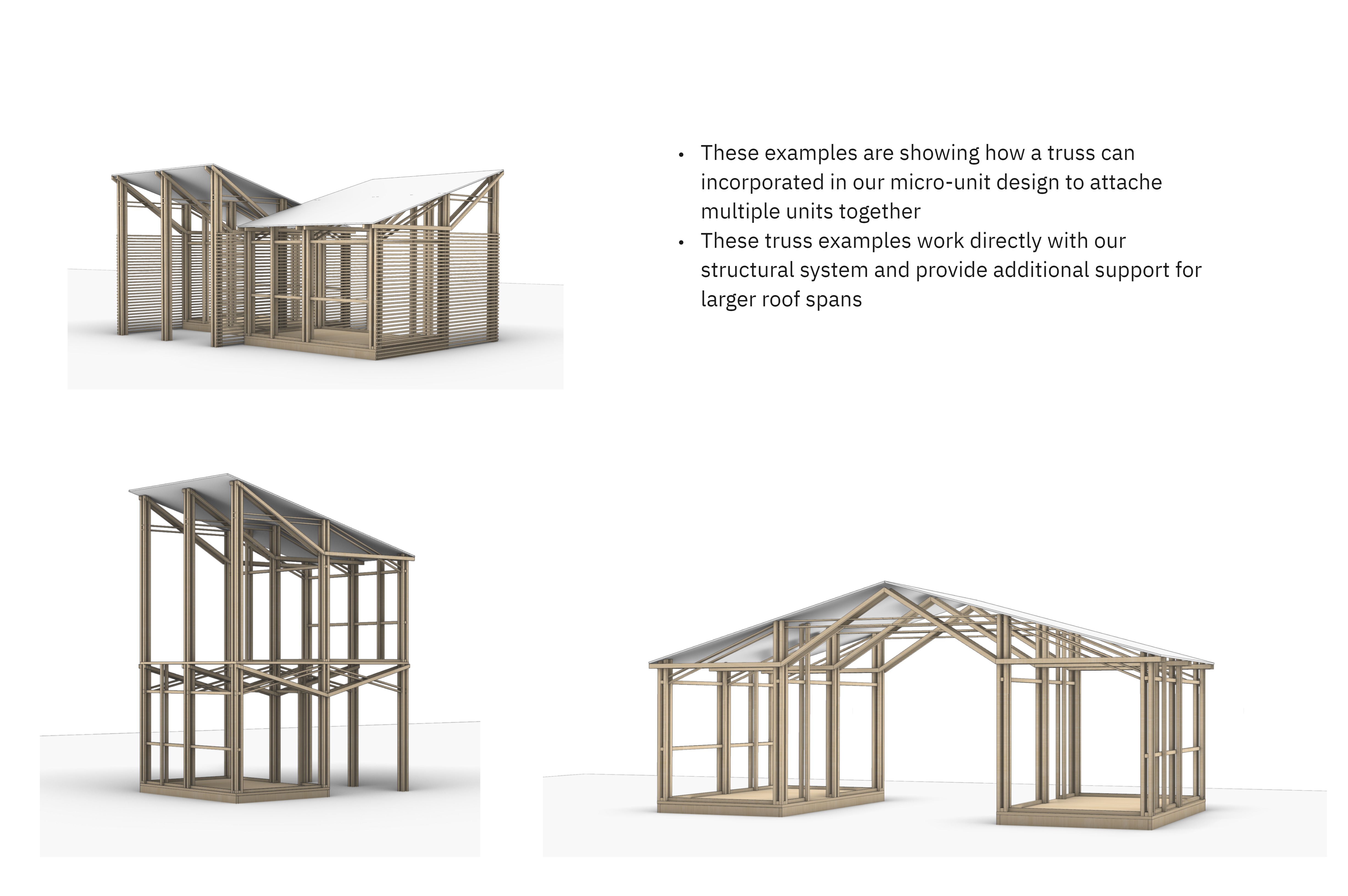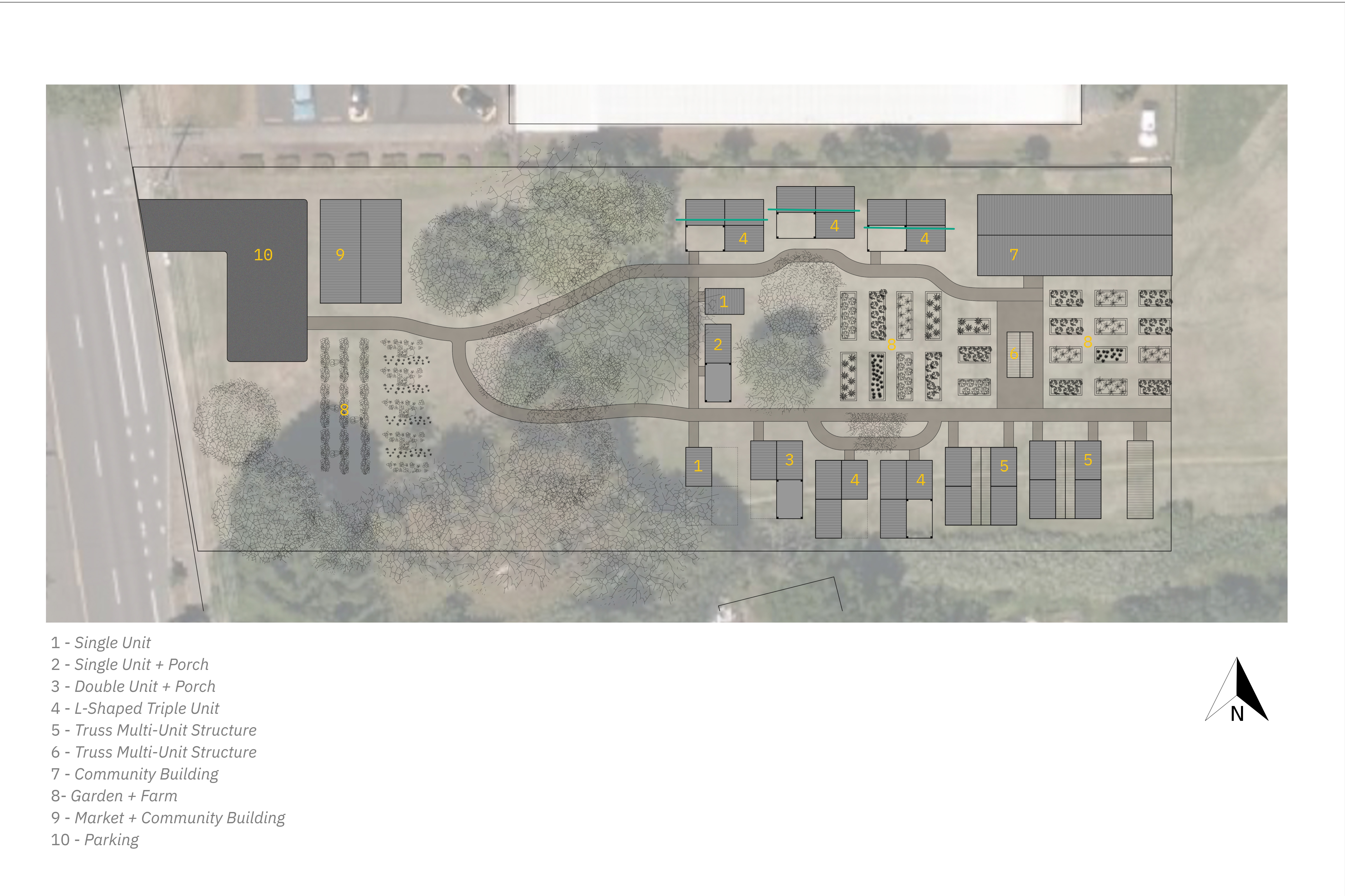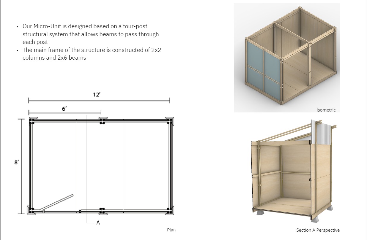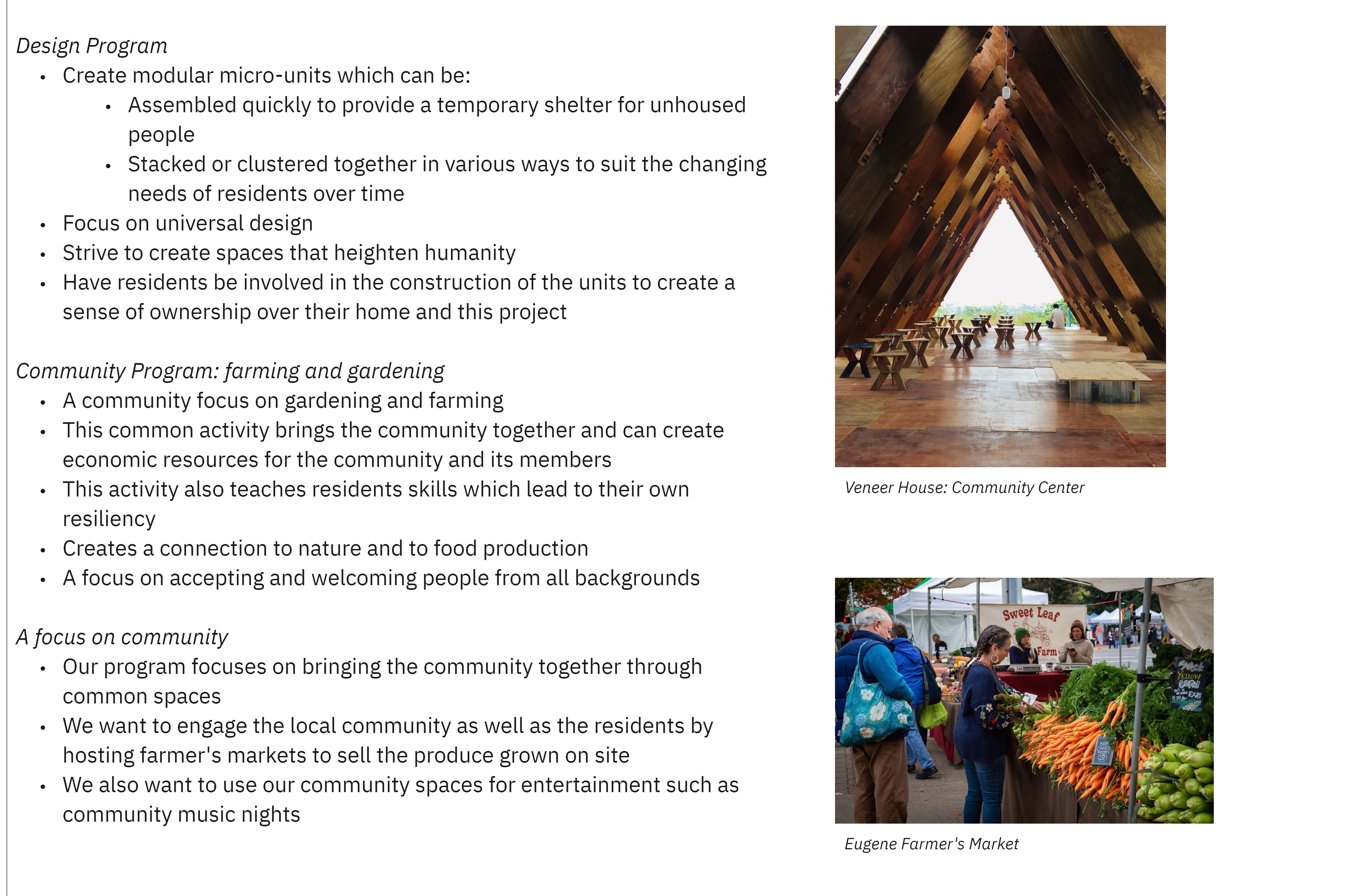Eugene has one of the highest populations of unhoused people per capita in the country. Our goal in creating this community is to provide people with shelter by designing micro-units that can be quickly assembled and are made out of inexpensive, but durable materials. In this project we are striving to create community for people who truly need one. To do this we hope to create a community focus on gardening and farming.