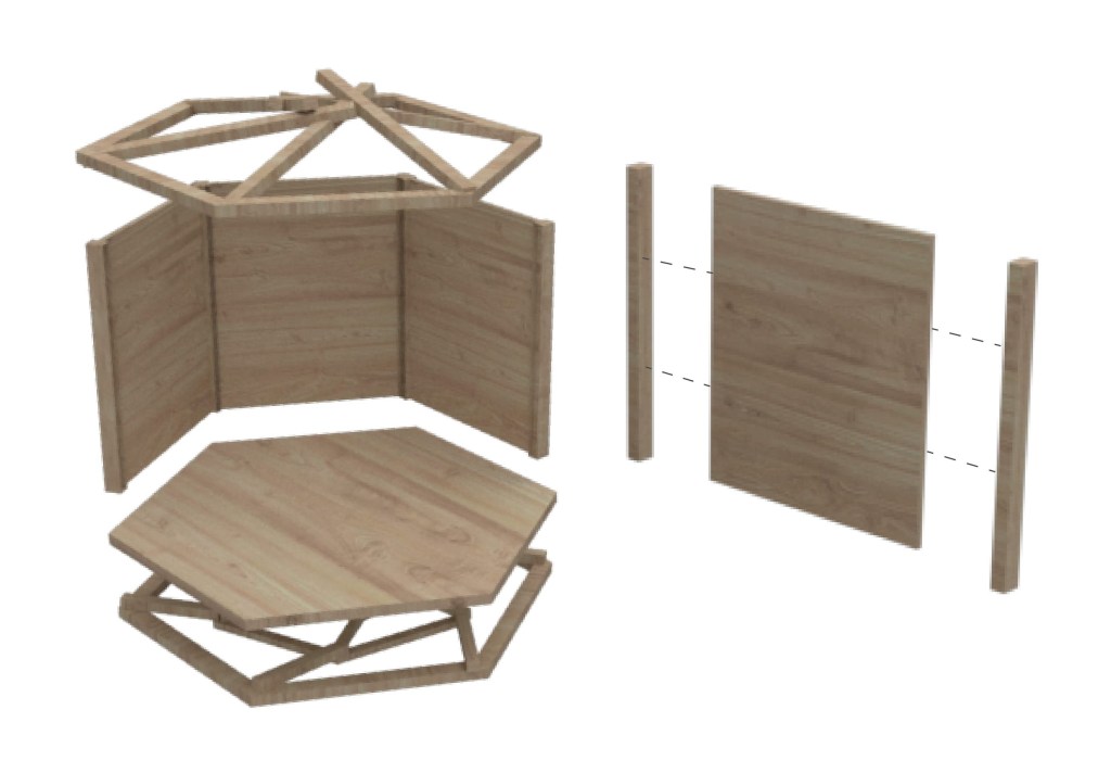 This hexagonal design combines its unique design and reciprocal roof system to provide a safe community to those in need in Eugene. This design accommodates both large families and single people with both clusters and stand-alone structures. The community garden, community space, and areas set aside for private backyards come together as a welcoming space.