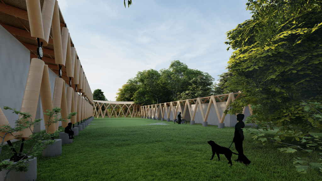 After gaining inspiration from raw-wood precedents like the Roundwood House by Rural Studio, we have been developing a system for using timber poles in their most structural and natural form. The unique hollow steel tube connection was a low-stress precursor to our current modular steel connection, and promises to provide a mass-producible system for connecting unprocessed timber. The system of constructing a canopy for tenant-built units leads to the idea of participatory architecture wherein a community of individuals come together and build their collective future. Through the development of a parametric system and phased construction timeline, we have landed on a good mix of designed structure and pride in ownership.