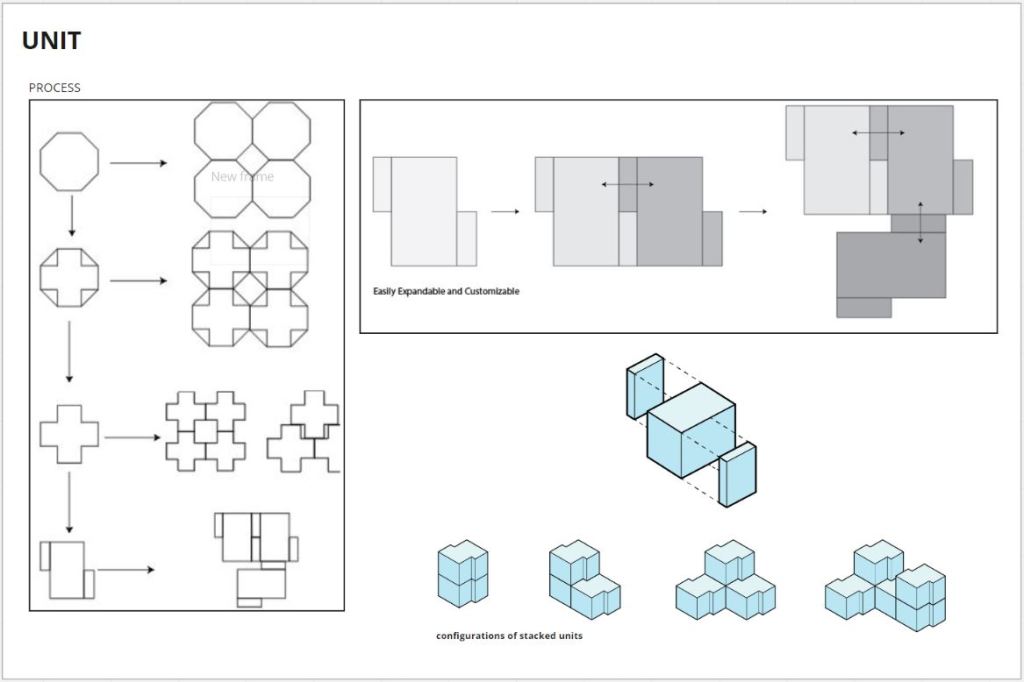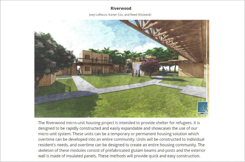 The Riverwood micro-unit housing project is intended to provide shelter for refugees. It is designed to be rapidly constructed and easily expandable and showcases the use of our micro unit system. These units can be a temporary or permanent housing solution which overtime can be developed into an entire community. Units will be constructed to individual resident’s needs, and overtime can be designed to create an entire housing community. The skeleton of these modules consist of prefabricated glulam beams and posts and the exterior wall is made of insulated panels. These methods will provide quick and easy construction.