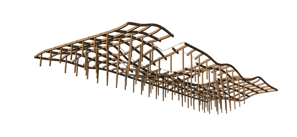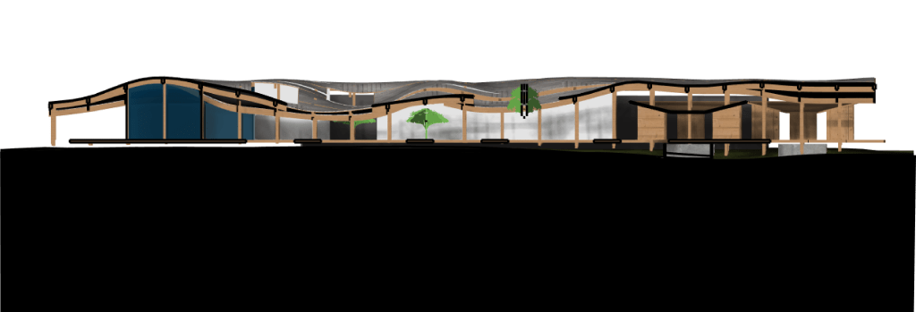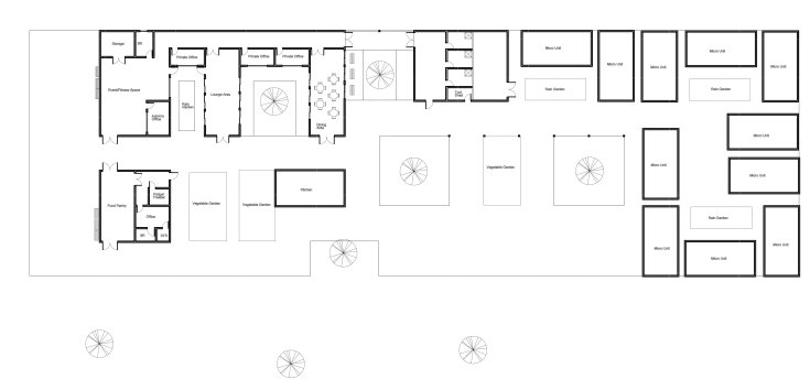 This multi-phase project aims to fill the need for emergency housing with rapidly deployable shelters alongside plans for future development to meet the needs of a permanent community. The first phase of emergency response includes the construction of small micro-units to serve as sleeping pods. Later, modular wall sections can be added to these initial structures to expand their functionality. A large overarching and softly undulating overall structural form will be built as a later part of the phasing, serving to expand the livability of the structures even more. A community center will be built towards the front of the site allowing the residents ample space for dining and other community-enhancing functions. The very front of the site that boarders River Road will be aimed at a broader community use, such as farmers markets, food trucks and large outdoor events, enriching the surrounding neighborhood.