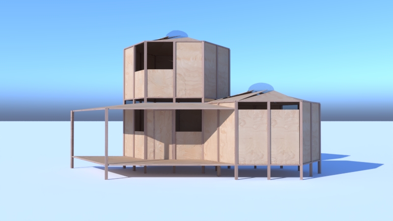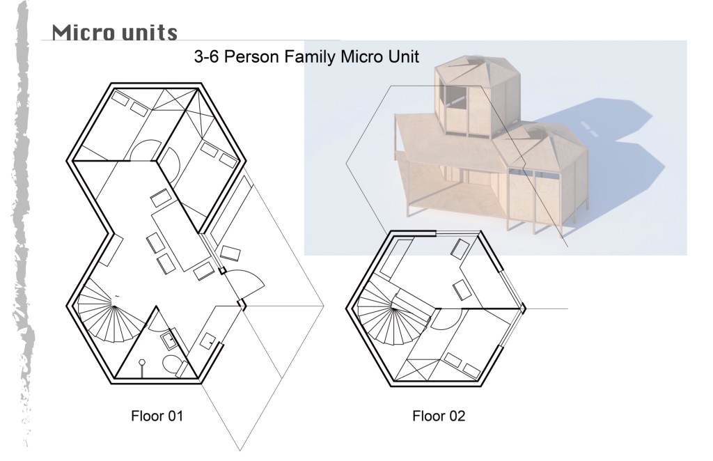 The hexagon shaped units are great for temporary housing as well as more permanent housing due to fabrication sequence and ability to be stacked.