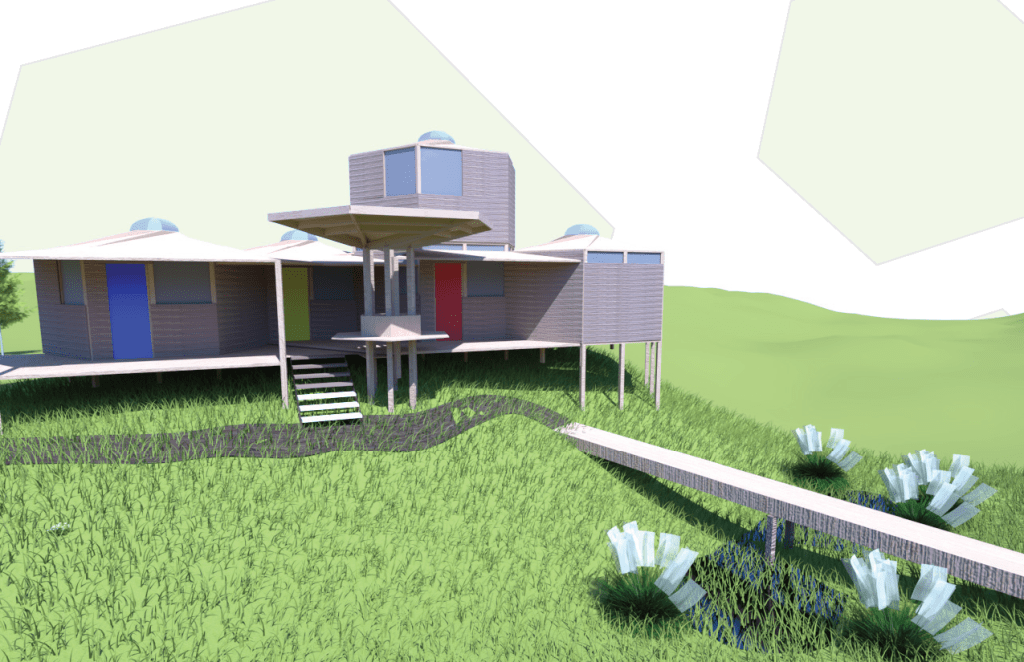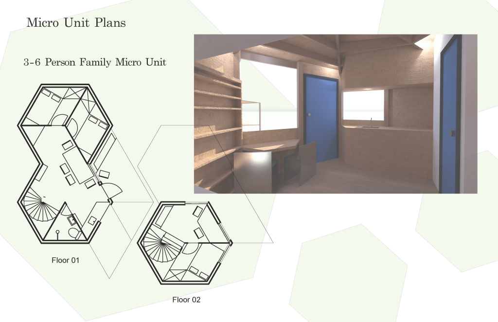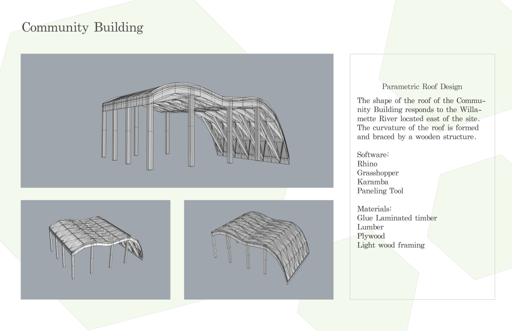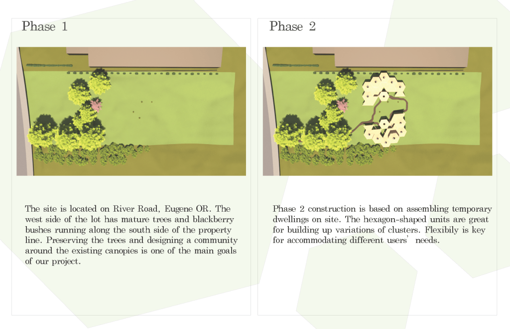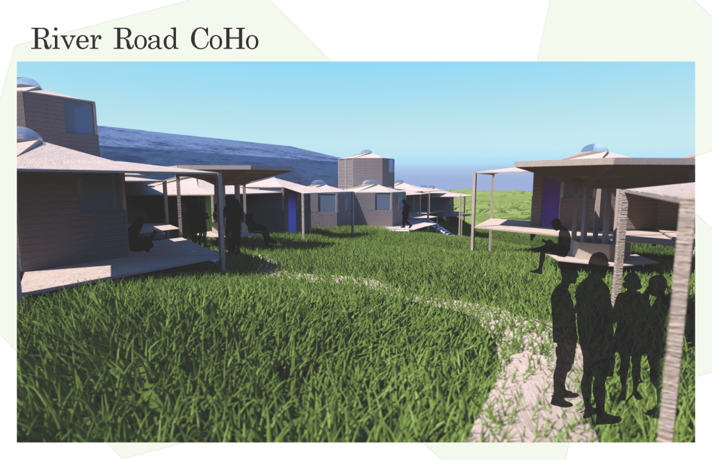 River Road CoHo is a co housing project project made up of micro unit clusters to house vulnerable and unhoused populations in the Eugene area. The clusters face each to create a sense of community and each unit can be distinguished by the color on the door, creating a sense of identity. The hexagonal module was a driving design feature and the layout of the clusters reflects this in its honeycomb like pattern. One aspect of the project was that the future residents would have the opportunity to build a portion of the unit making themselves feel empowered by creating their own living space. The onsite Community space uses mass timber and parametric modeling to emulate curvatures found in the winding Willamette River nearby.