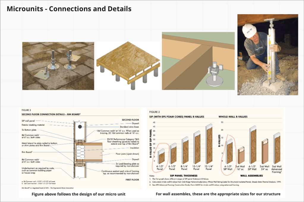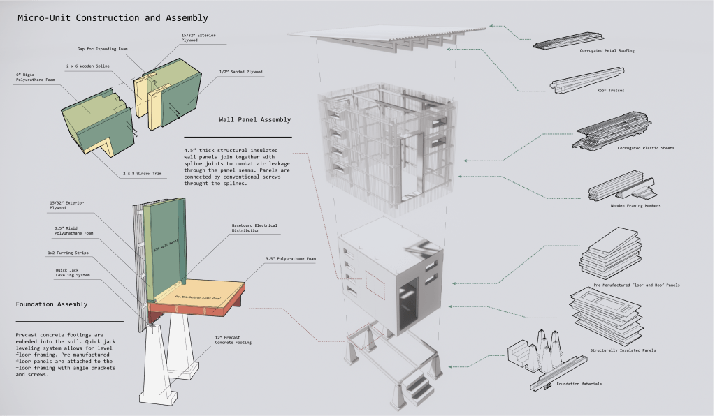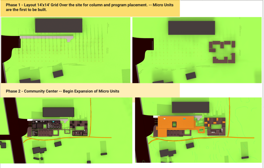 1. Micro Units – Must be constructed by a small group of people. Must also be cost efficient. The Micro Units are intended as permanent housing structures that start off as plywood pods, and has been designed to expand over time into a larger living unit to serve the needs of residents. The cluster of units will initially be supported by mobile facilities such as porta-potties and tented spaces.