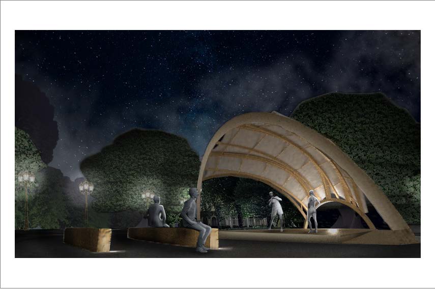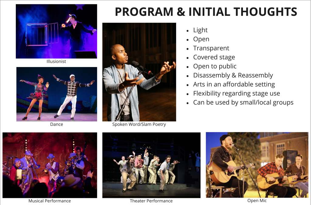 Moving forward, we plan to refine our design for portability and ease of connection and construction. Our structure is simple. It is supported with a front and back arch with curved members that span between the two, creating a fluctuating roof with struts between. To shrink our design to meet our goals we plan to flip the direction of the ramps where one would enter at the back of the stage. This will solve the head clearance issue that caused the excessive expansion of our structure. The shrinkage also creates, at first glance, wasted space at the back of the stage. However, we believe that the inclusion of a sounding board that doubles as equipment storage will be a beneficial addition to the space both in structural, lateral, acoustic, and aesthetics.