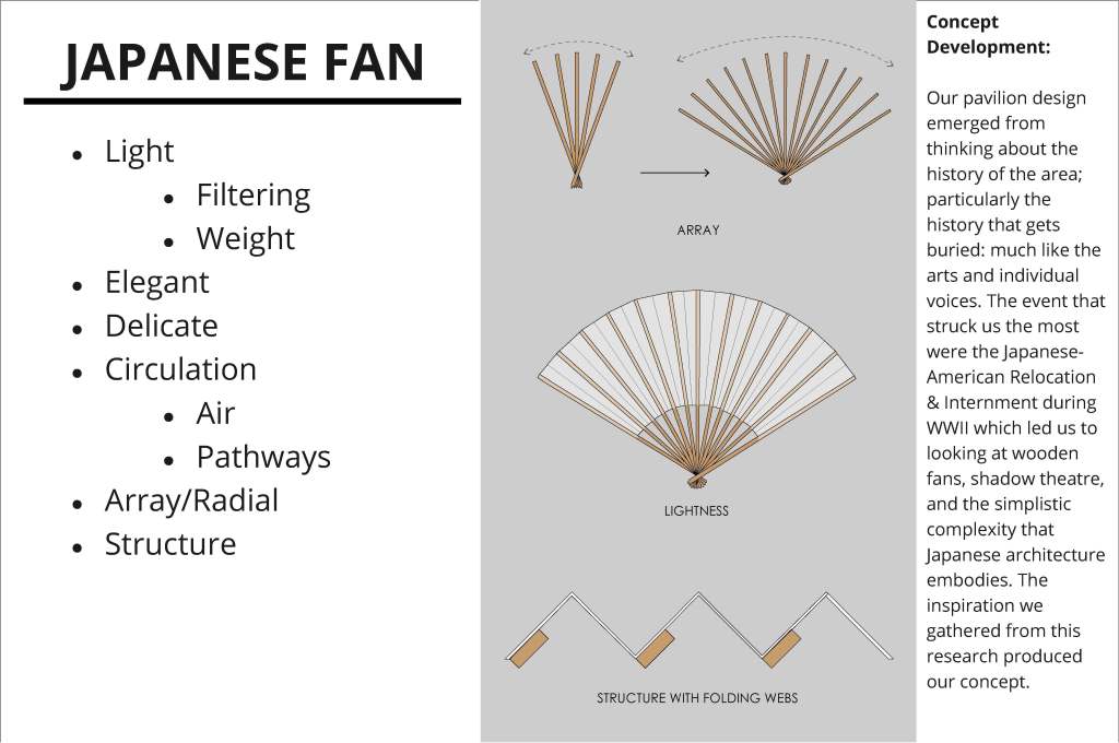 Our structure, since the beginning, hasn’t been so much of a fan in design or structure. It has been more of a fan in concept, most reviewers so far have talked about our project not mimicking the fan structure that we like so much. We feel that the fan does not apply to our design and that we will be focusing on our structure system that embodies a light system of curved members and a truss system supported on two primary arch members. We want our structure to have characteristics that express lightness, airiness, and inviting rhythm. The design has gone through many alterations since the first midterm, these interactions explored cantilevered curved members, truss systems for cross bracing, and arches.