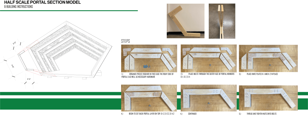 A half-scale prototype of a section of the portal is displayed to show the type of connection (steel knife plate and bolts/nuts) that will be used in construction. The completion of this model allowed us to explore the feasibility and constructability of our design.