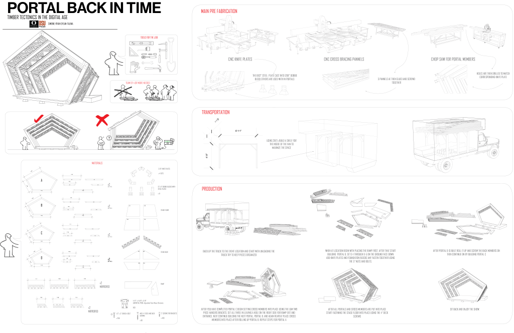 Illustrated below is a basic instruction manual of the steps and processes that would be required for the construction of this stage. Additionally, pre-fabrication and transportation of the components is included to gain a sense of the practicality of assembly and disassembly demonstrated in the design.
