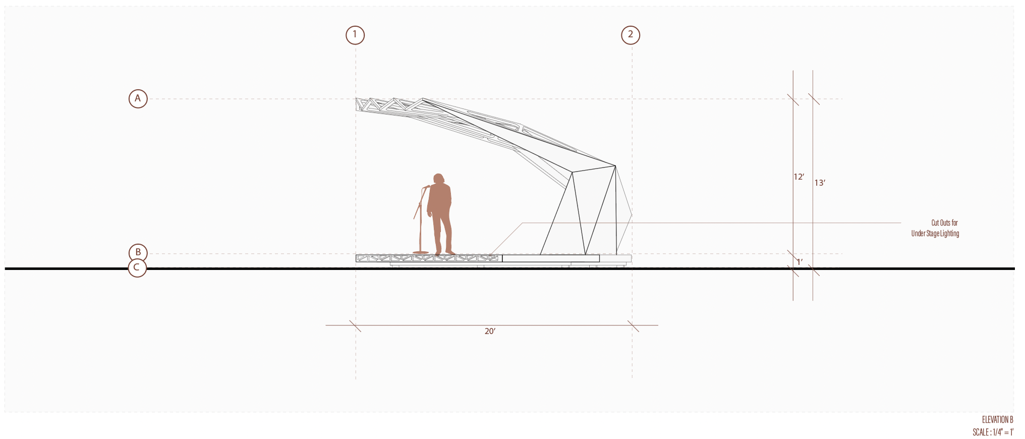 Our team found that placing the performance space in the central area of the site near the northern E-W path and facing east, would acoustically engage the whole site. This centrality would also maximize the structure’s visibility, reinforcing the conceptual intention and therefore the event’s identity of fall-time celebration.