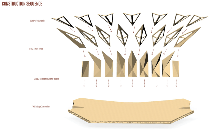 In order to reduce waste and maintain an identifiable language about the performance space, these folding chairs were devised to be quickly put together and give the audience a comfortable place to sit.