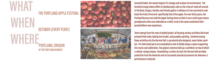 This site is located in the heart of SE Portland. Within the vibrant Sunnyside neighborhood, Portland Nursery reside just at the western base of Mt. Tabor. Around October, the winds from the Columbia River basin can pick up while the Portland rain returns. It is very likely that this event will have inclement weather but often the event is held on a sunny weekend. Much of the site faces South where the plants thrive and people can enjoy the autumn sun. Glencoe Elementary is the neighbor to the south where children can often be heard. During the event, there is a lot of foot traffic in the eastern and northern half of the site. Both green houses on the eastern border house many activities. The northern E-W path receives most traffic around the apple bin tent where guests flock to purchase many different apples.