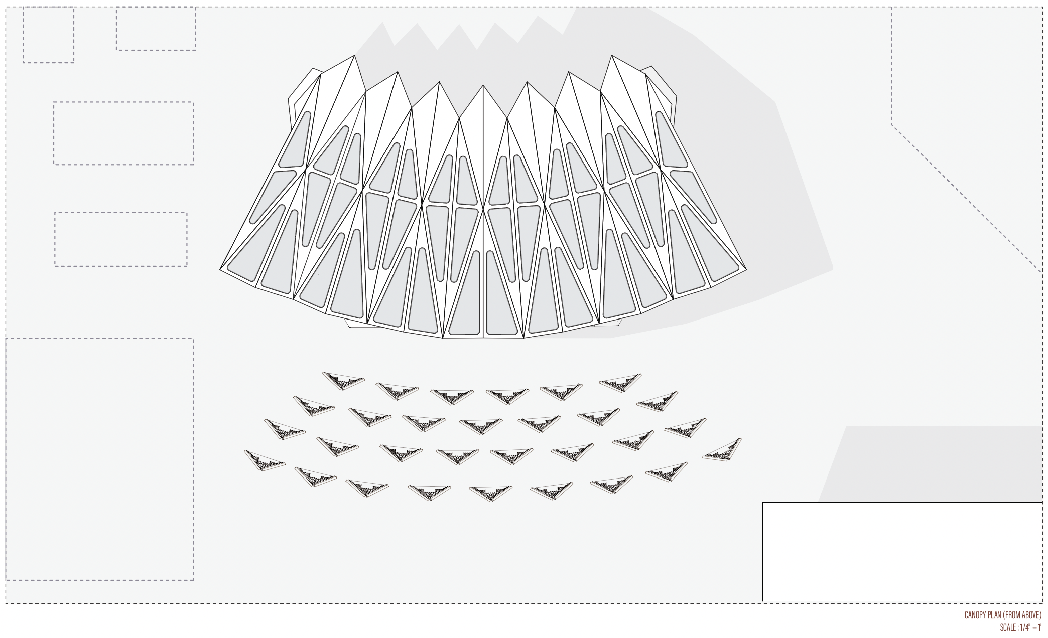 The second study was a smaller pavilion at the Plaza Escuelas Trevijano in Spain. This structure also engaged in the natural rigidity of the folded origami form but used hinges as the connections. This had brilliant design implications when light could shine through and the space-saving aspect of their foldability. Unfortunately, the clean corners were lost, the gaps would cause leakage during rain, and the strength of the hinges with our thicker, cantilevering plates was questioned. One aspect of the hinges was the inset plates of the hinge.