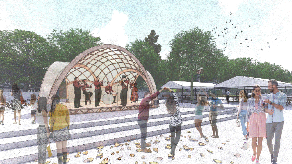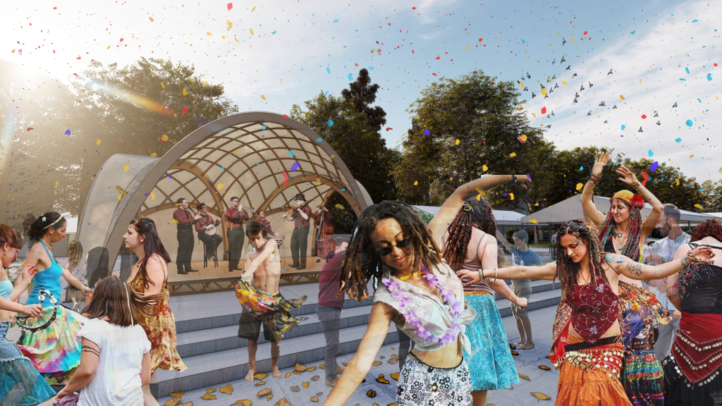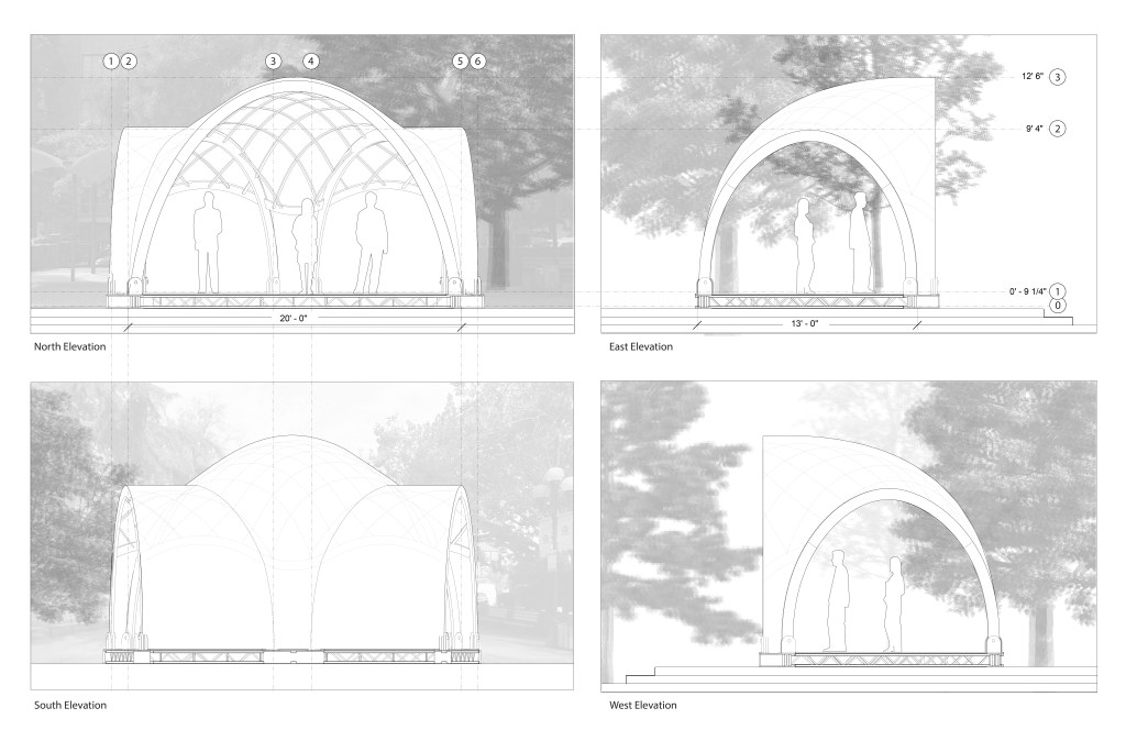 The Eugene Saturday Market Amphitheater is a seasonal installation meant to provide a performance space for local artists and bands in the Eugene Saturday Market during the spring/summer time. While the structure’s primary purpose is to serve artists and therefore act as the focal point within the market, the bandshell can also serve a variety of other purposes when not in its primary use. The structure’s three openings allows the structure to be interconnected with the rest of the market, adding not only versatility, but richness to the events that may occur there.
