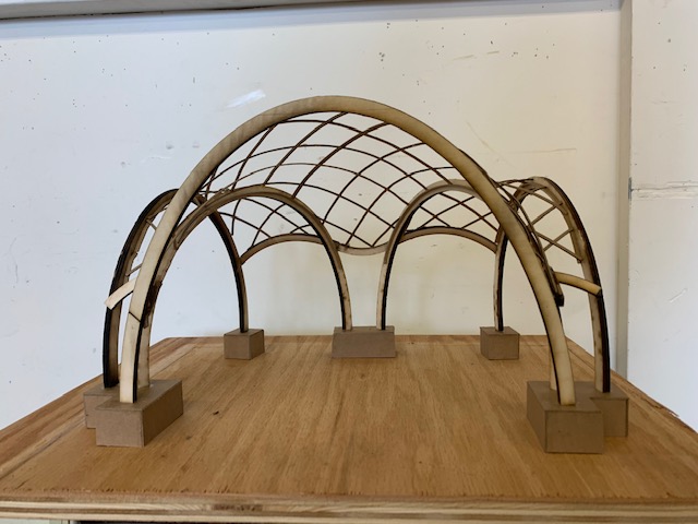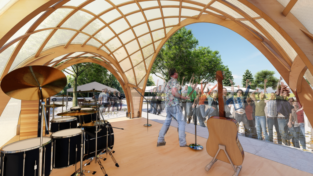 Inspiration for the design of the bandshell came from vaulted domes typical of European cathedrals. We wanted to bring these beautiful forms to the Saturday Market but with a more modern touch. Specifically, we wanted a lighter and airier version. To do just this, we used very thin LVL lathes to form the grid-like domes that nest in between the heavier curved edges of LSL.