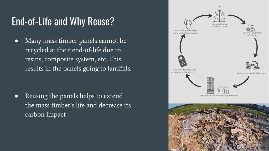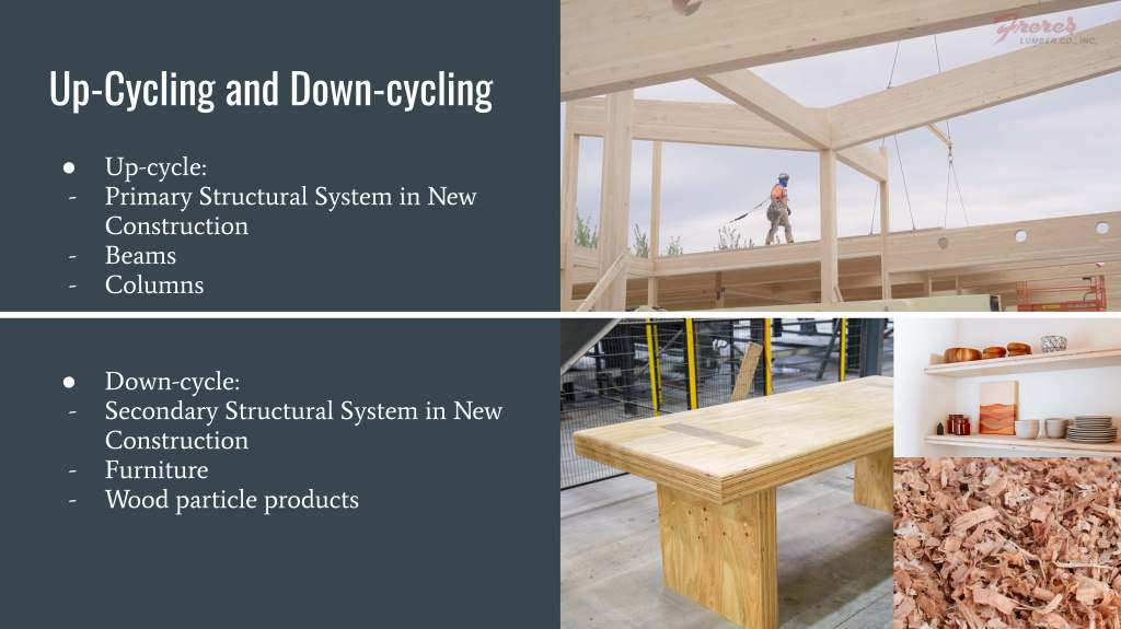 The main focus of the research is to look at keeping the timber products as structural members, mainly primary structure that continues to support loads. This is mainly focused on upcycling the product into beams, columns, or smaller panels when considering taking existing panels and reusing them. Downcycling must also be considered for panels that may face damage that leaves them structurally insufficient to be reused at a gravity-loaded system. Downcycling can also prevent the panels from being placed in the landfill by using the product to create furniture, wood particle products, and other non-structural objects.