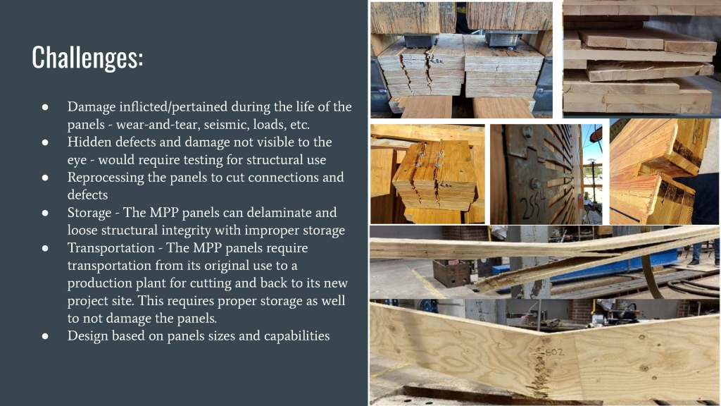 Challenges throughout this process must be considered. The reused panel may initially face damage from its previous life with seismic activity, loads, damage from deconstruction, hidden defects not visible to the eye, reprocessing to cut connections and defects off, proper storage based on the materials to prevent delamination and other loss of structural integrity, transportation, and the new design being influenced by the reprocessed material’s sizes and capabilities.