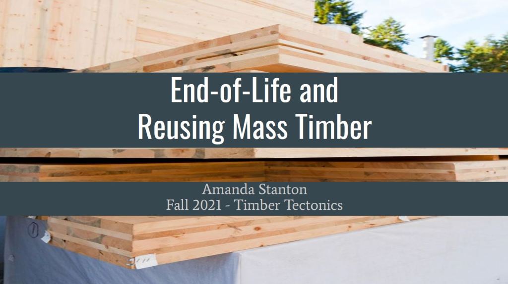 Mass timber has minimum end-of-life scenarios. In many cases the panels are disposed in the landfill due to the adhesives that are used in manufacturing the material. Recycling to biofuel and incinerating for bioenergy have come into play, however, the adhesives and chemicals create barriers for these disposal methods. Another option is reprocessing and reusing the material. Many mass timber products could have the opportunity to be dismantled from old construction, cleaned, reprocessed, and reconstructed into new structure. This would allow the carbon sequestration of the mass timber products to continue and reduce the carbon impact the product may have if disposed of in a landfill to decompose and release carbon dioxide and methane. However, a series of challenges must be taken into consideration when considering reuse. My thesis looks at creating a guideline to address challenges and opportunities when considering reuse and applying it to a design project.