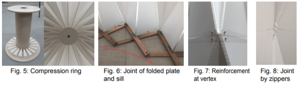 A project created by N. Sugiura, Y. Nakamura, H. Tagawa, T. Uno, and S. Okazaki of the Mukogawa Women’s University for the 4th International Conference of Archi-cultural Interactions through the Silk Road examined how the Yoshimura pattern can be a solid point of reference for structural legitimacy. Their Origami Dome was made of a propylene cardboard of varying thickness that created a small space for people to sit and relax.