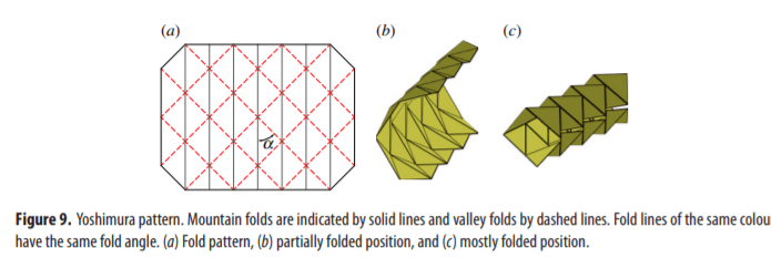 The Yoshimura pattern follows a similar ruling, except there are only vertical folds and diagonal folds to form a diamond pattern. This creates a significant stiffness in the axial direction.