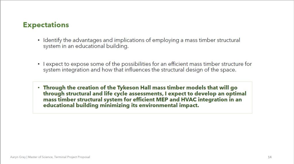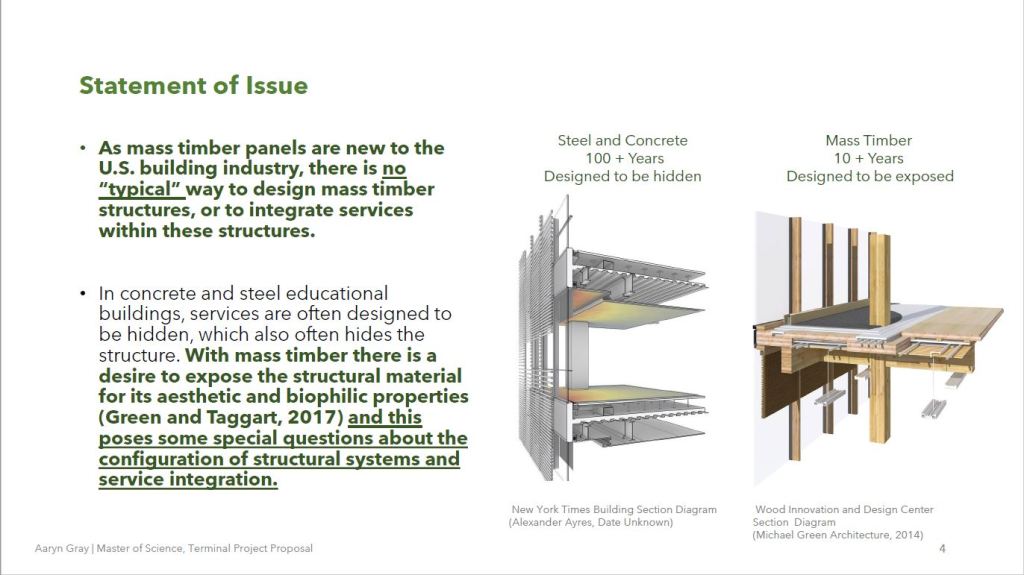 With mass timber products being a relatively new product here in the United States, there is no “typical” way to design mass timber structures or to integrate services. Every project offers its own standards and limitations, and these can implicate changes to the mass timber structure itself. This research seeks to explore a series of North American mass timber case studies to analyze the advantages and disadvantages of their structural, service, and integration solutions. Following this study, the lessons learned will be applied to an existing, recently completed university building with a steel and concrete structural system, by substituting its structure with a mass timber one. Using the existing structural system and new mass timber alternatives, comparisons will be made for both structural and system integration approaches to see if sustainability and efficiency goals could be achieved with a mass timber system. Through this applied research method, we can begin to understand how the mass timber structure can be both optimized and designed for better and more efficient system integration in educational buildings.