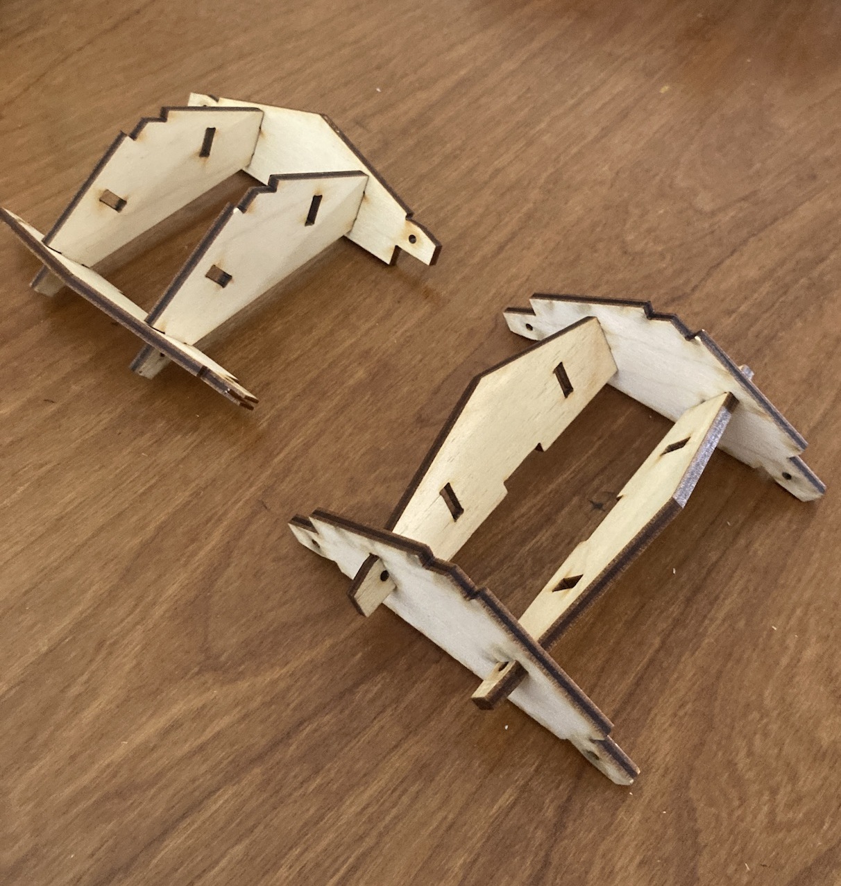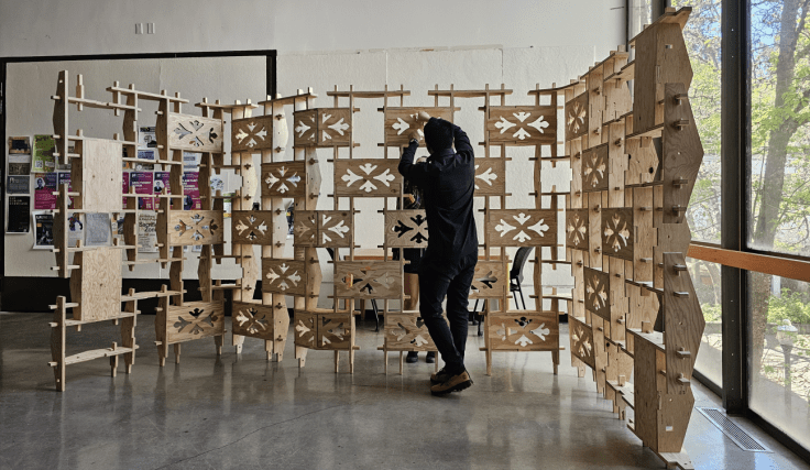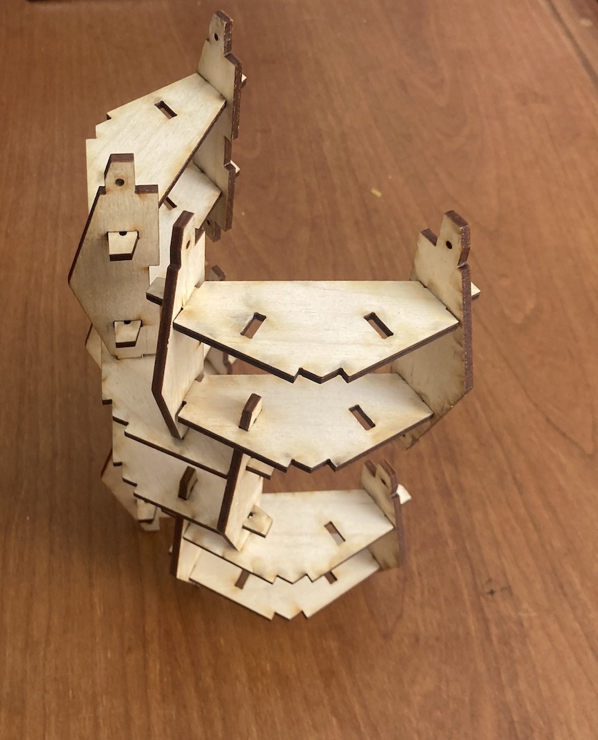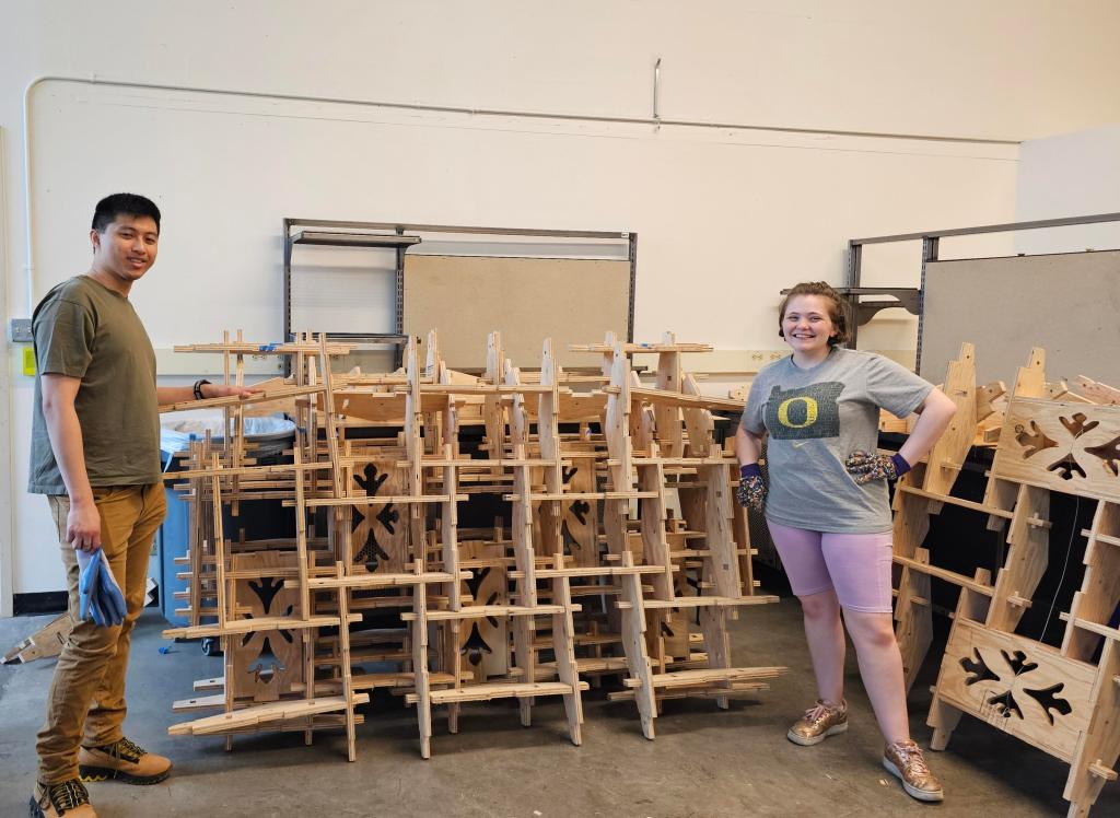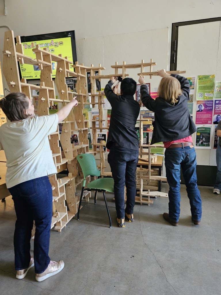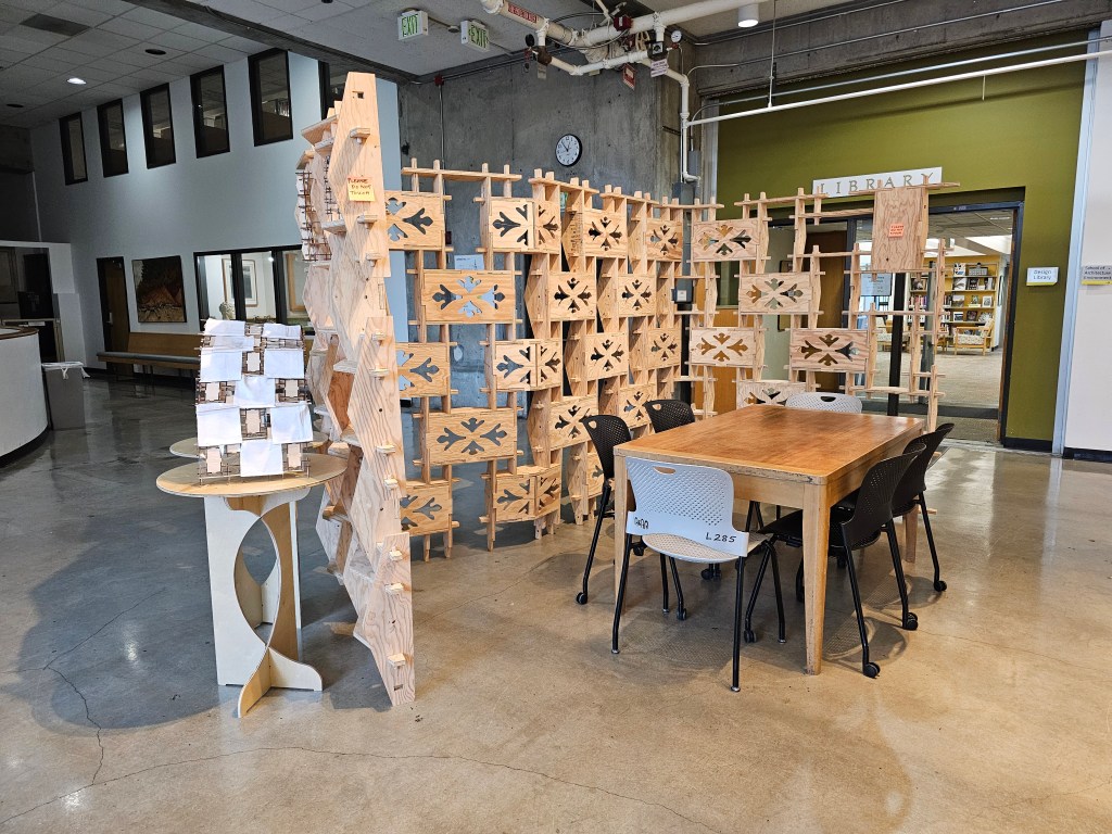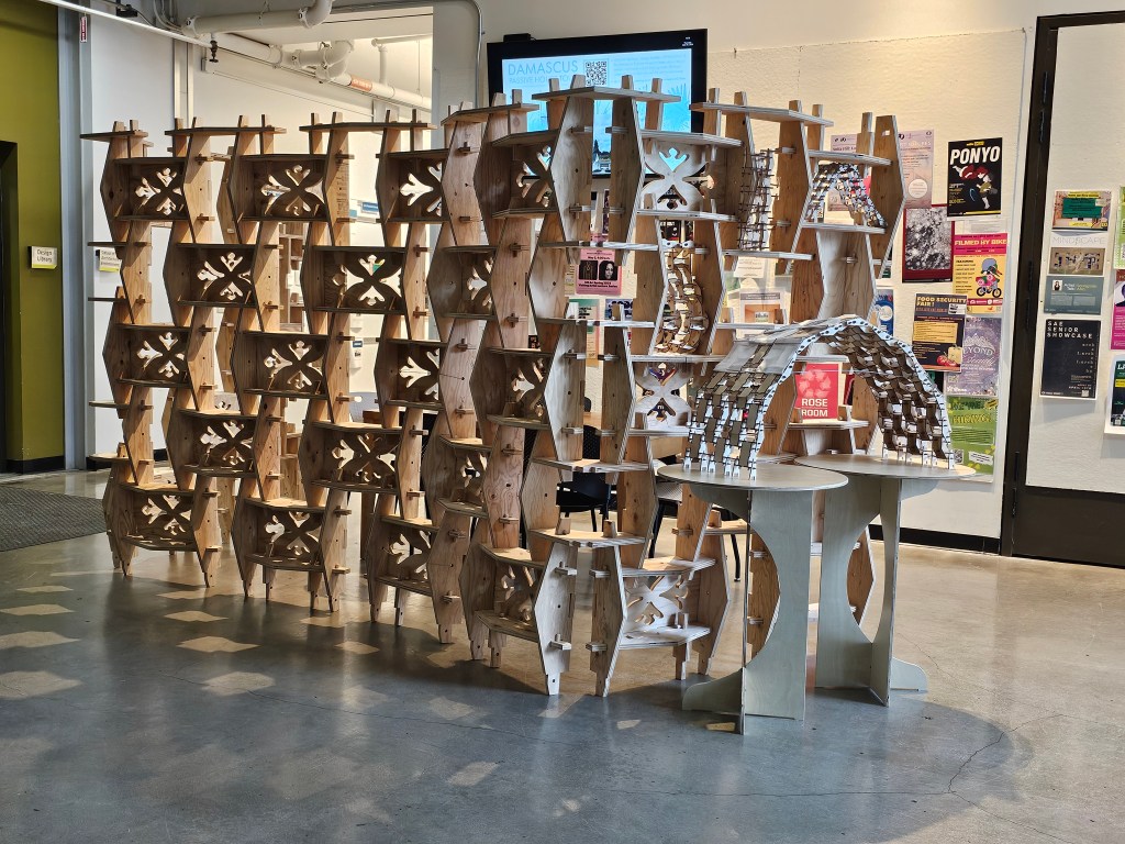 After constructing and deconstructing the arched pavilion at two Oregon State University locations, we were curious about how the flat plywood components could be reused. The Fall 2023 Timber Tectonics students imagined alternative designs and then Nancy Cheng worked with assistants and Design Development Media students to design new pieces to extend the toolkit’s flexibility for new applications.