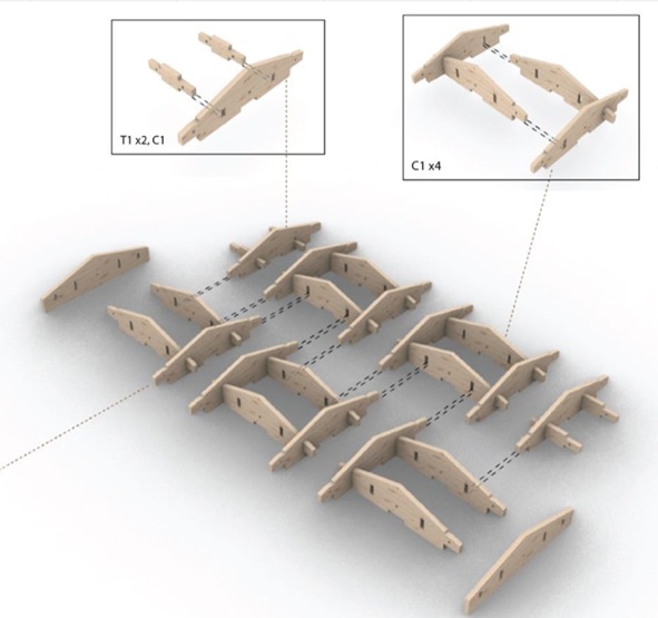 Designers need time to experiment with the components to understand the basic structural system. Replicating the original geometry is the first step towards improvising new configurations. Therefore to support reusability ideas, the original and new corner components were laser cut out of 3mm (1/8”) plywood at 1:6 scale. The kit-of-parts is comprised of 192 copies of a standard piece that create a flat reciprocal frame, along with specialized corner, edge, base and face components.