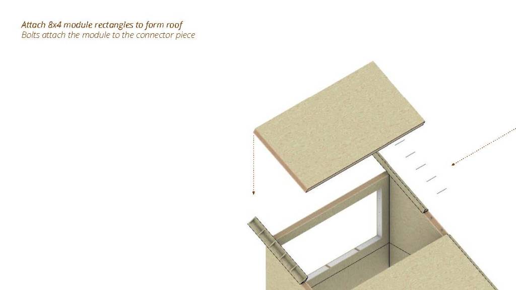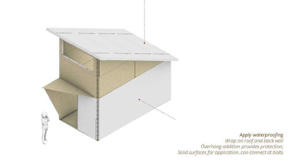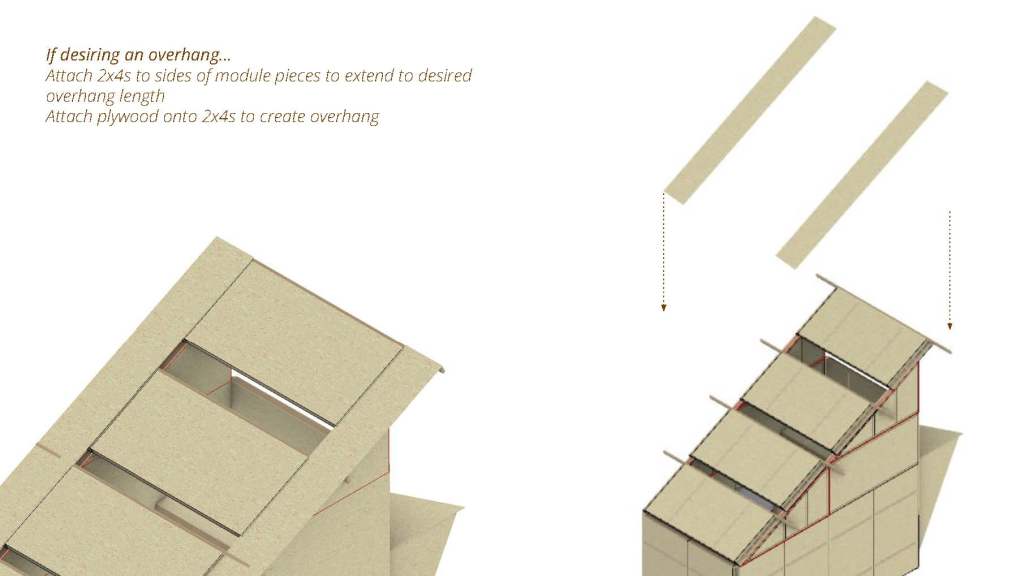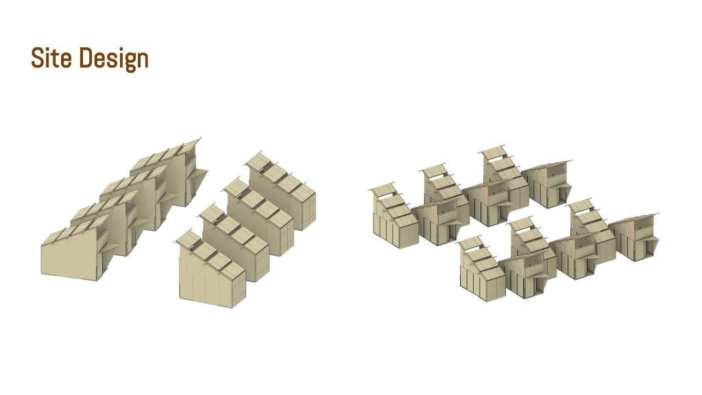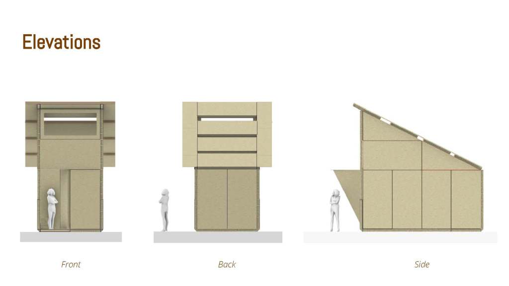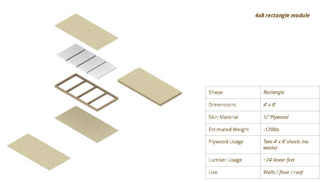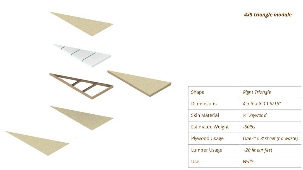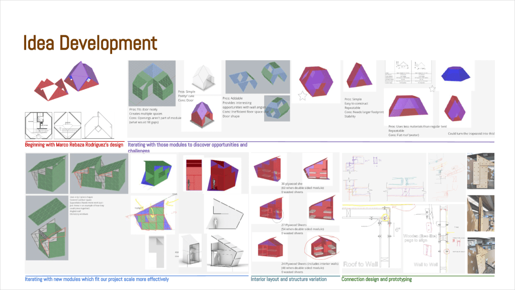 Some of the major achievements with our design include maintaining only two unique building modules, minimal waste through utilizing entire 4×8 panels, creating a warm & welcoming space for emergency shelter users, variable module layouts for different shelter styles, and lastly, being able to use inspiration from Marco’s design to create triangular modules.