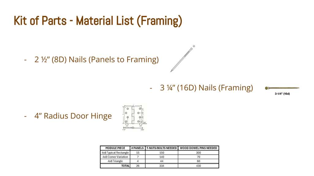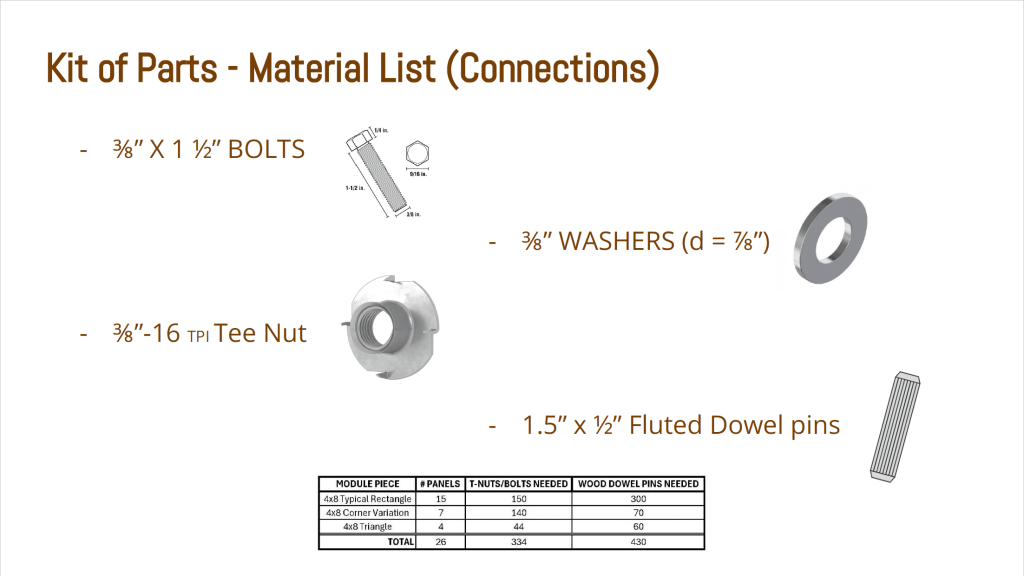In addition to the plywood and 2×4 lumber used to fabricate the SSP panels, we will also be utilizing a T-nut and bolt system, wooden dowels, and other typical fasteners like nails.