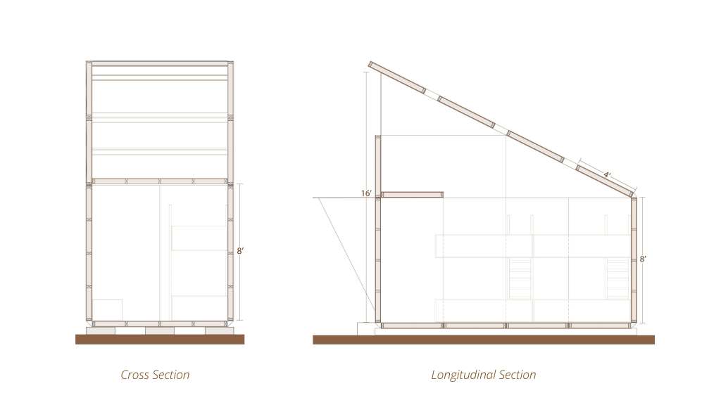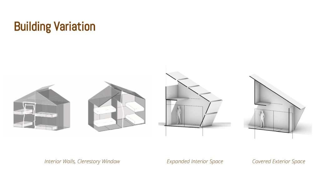 With our design, we embraced the idea of verticality by incorporating a lofted space enclosed by a shed roof with various openings for daylighting. Additionally, we included a covered entry and a large window for ventilation.