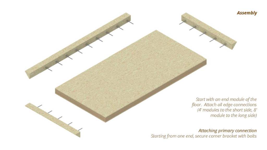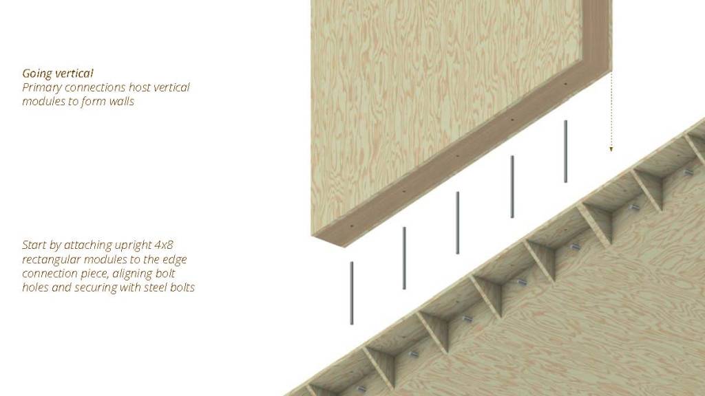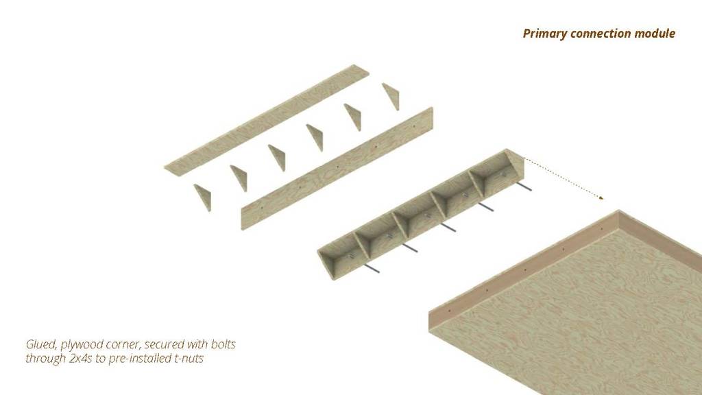 We proposed a T-nut and bolt system for our corner connections and a wooden dowel system for our in-plane panel to panel connections.