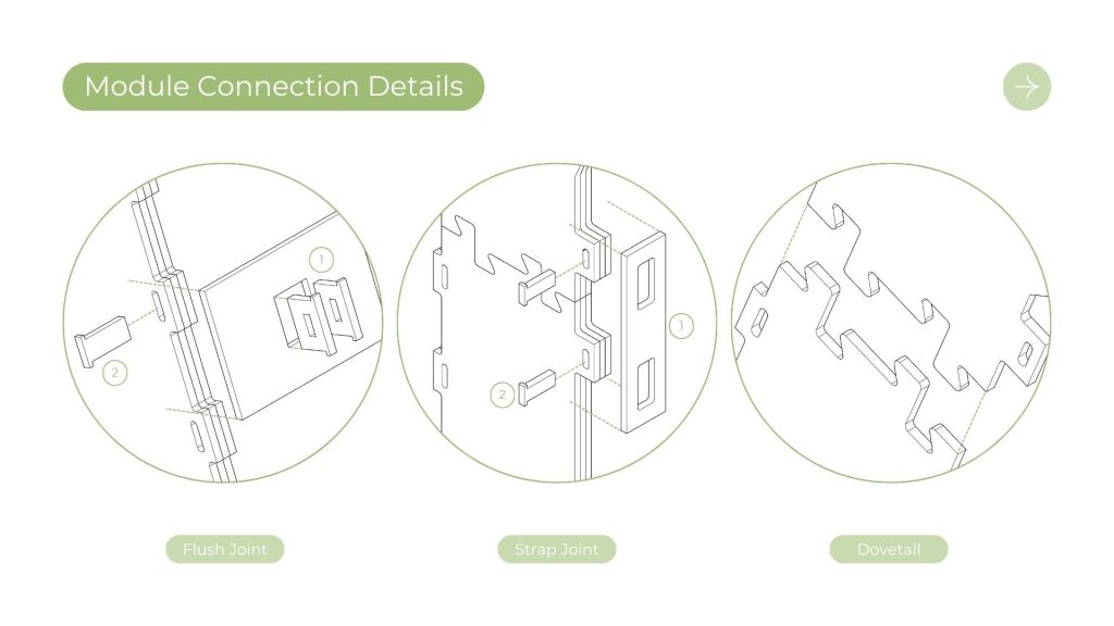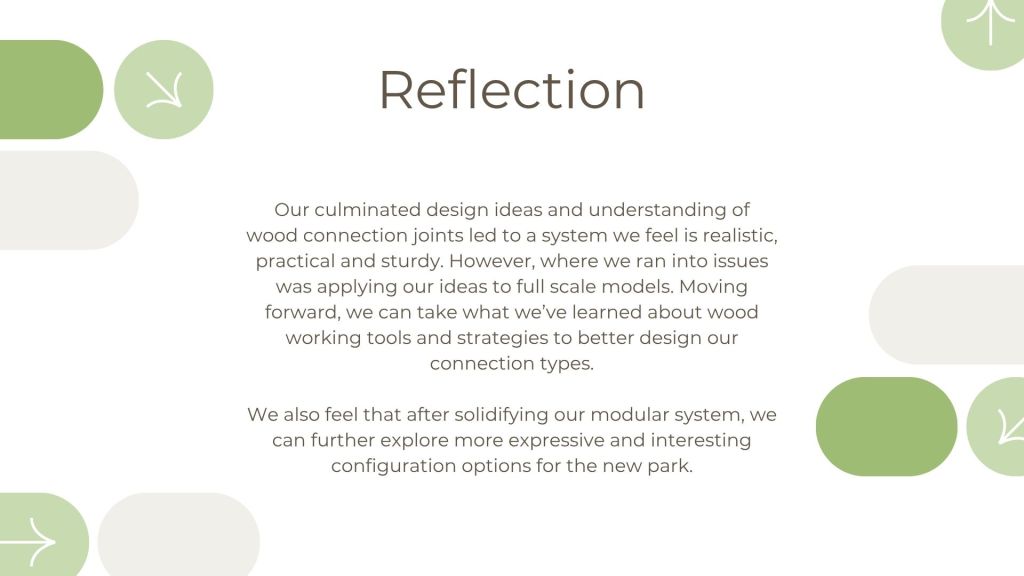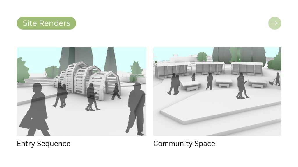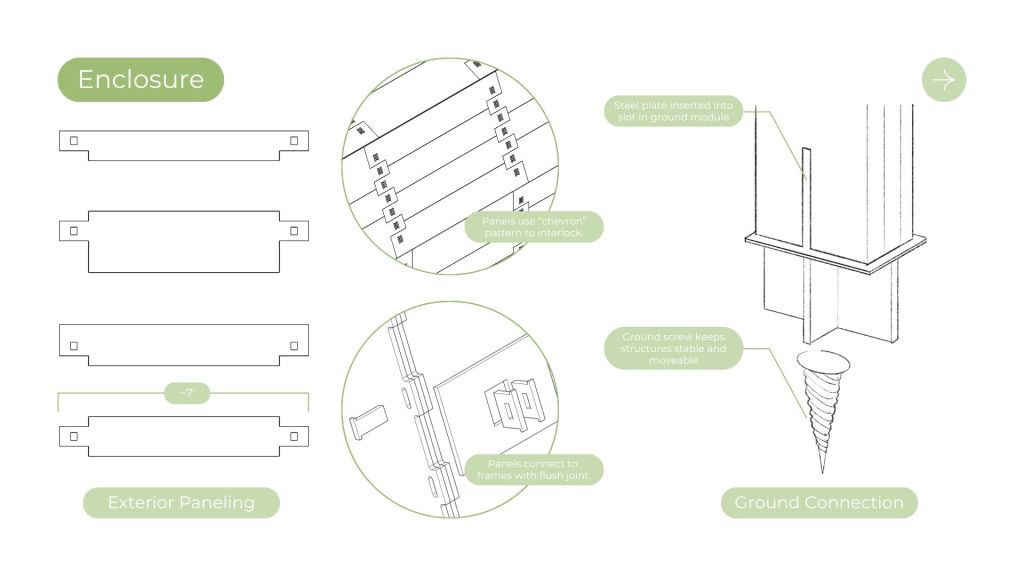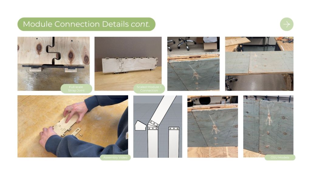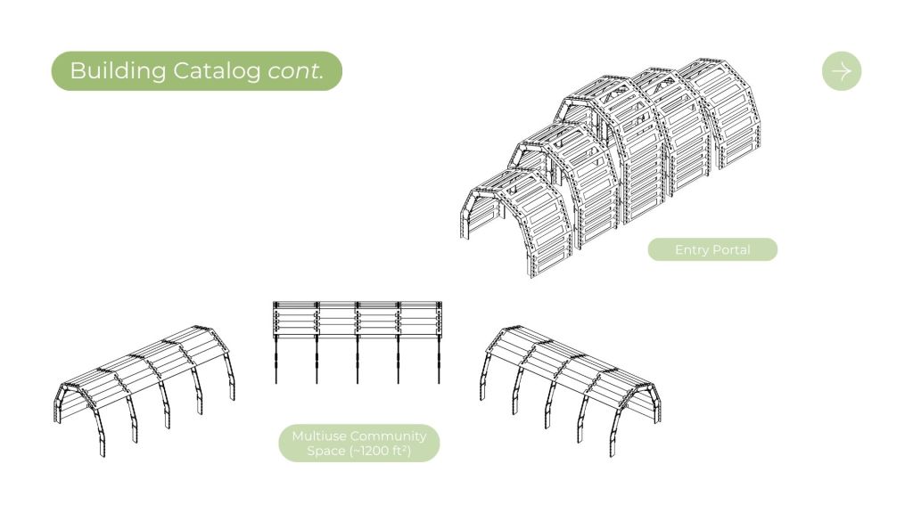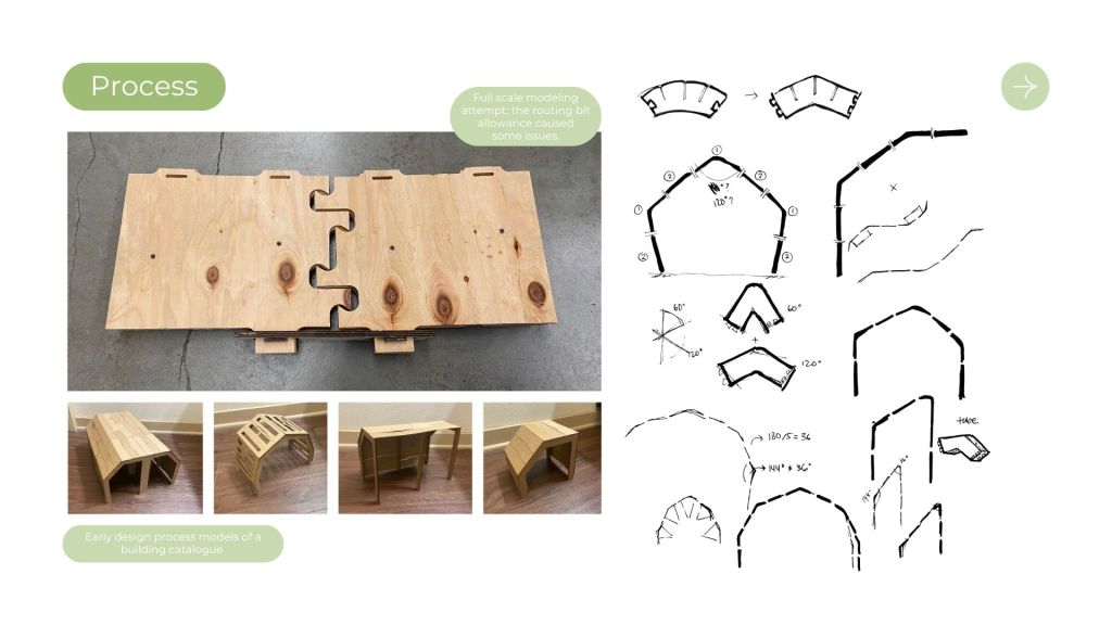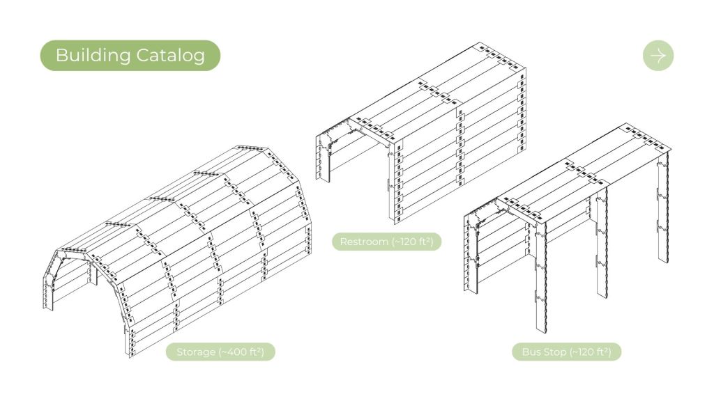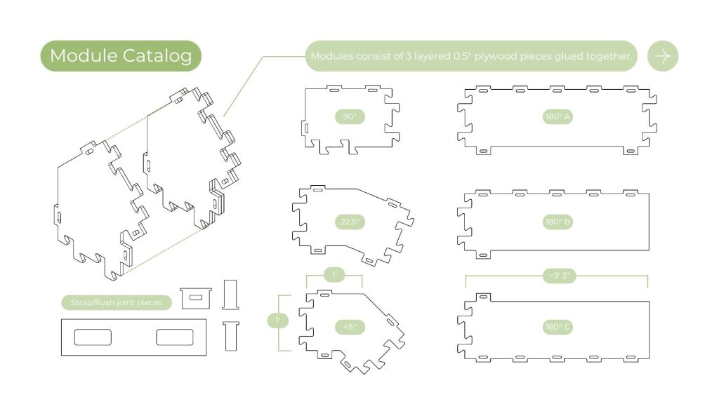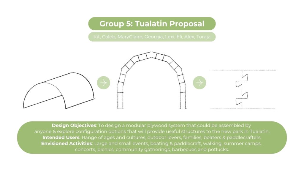 The design intent with this project was to design a kit of parts with reclaimed 1/2″ plywood, flexible enough to create a wide array of structures to satisfy the program for Tualatin’s park. This frame and panel system allows for the creation of both fully enclosed structures and open-air structures with expressive panel design patterns. This proposal was inspired by precedents from Veneer and Wiki house and aimed to emphasize expressive wood to wood joinery that allows for disassembly and reassembly as needed on the site.