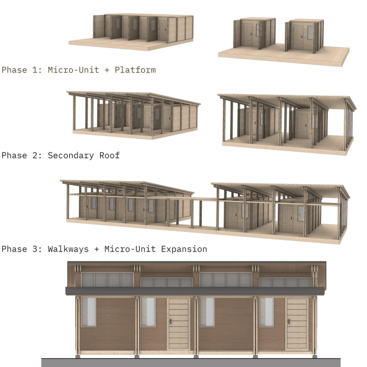For the Grove project, M.Arch. students John Miller and Justen Stiles worked with OSU doctoral student Sujit Bhandari to design a modular building system with four-post columns that could receive Structural Insulated Panels. Their renderings show how the system could be initially be used to rapidly create a village of tiny houses with a shared amenity building for hygiene, sheltered amidst existing trees. With a longer time frame and more labor, the same system could create a warming center and more livable housing options. Once the community was established, fund-raising would support constructing an elegant community building for shared dining, flexible workspace and supportive services that features natural light and wood finishes. Their project shows how a modular plug-and-play system simplifies construction and shapes spatial possibilities.