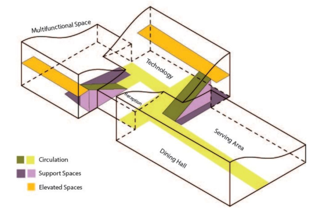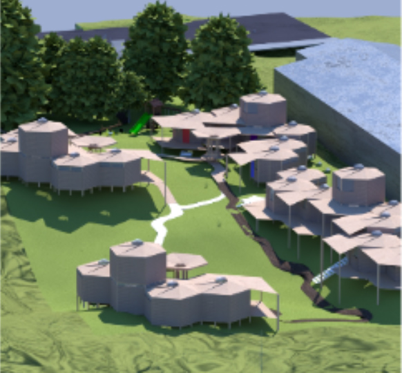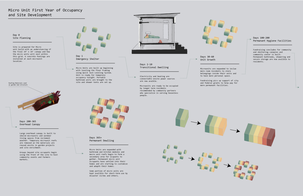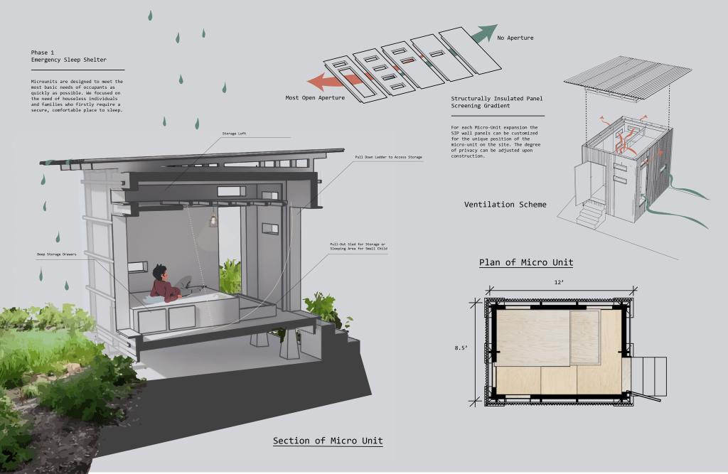 Site Design: Students debated about the challenge of visibility and openness of their settlements. If they were providing a refuge for those fleeing disasters, would residents feel comfortable with strangers entering the area? They navigated the challenge of how to be welcoming to neighbors yet protective of potentially traumatized residents by offering an amenity for the neighborhood at the street and directing passers-by around their more private housing. Students brought their own examples and insights to the problem, with Abigail Hernandez and Brooke Everard contributing valuable resources about trauma-informed design and cooperative housing camps. They envisioned what activities could enliven a community, what services residents needed and what could inspire them. Shared resources envisioned for the public street included food carts, a food bank, community rooms, and a basketball court.