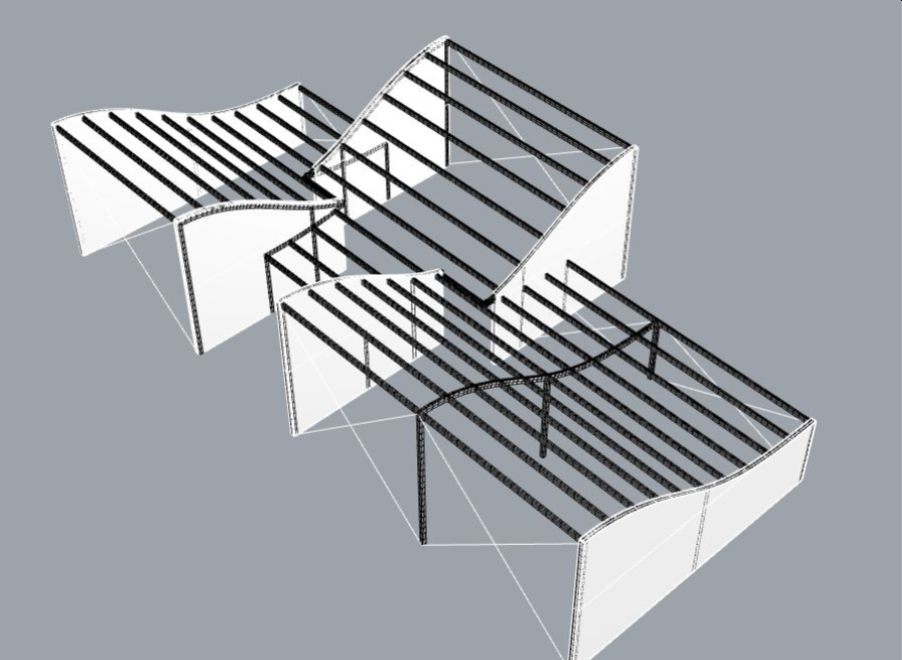 Construction: The Grove project shows how students first addressed small-scale micro-units for rapid construction and secondly used long-span solutions for the permanent community center. In studying the construction sequencing, they speculated on how two people could quickly build a small shelter, and then attract investment for long-term solutions that require more time, labor and resources. The project emphasized the trade-off between construction build speed and durability. Students explored how available stock materials could be extended through small amounts of customization and how pre-fabrication could expedite on-site assembly. They explored expressive structure for the community center. Below, Reed Olszewski, Joey LoRocco and Karter Cox used curved glulam beams spanning between light wood framed walls with cable cross-bracing for their community center.